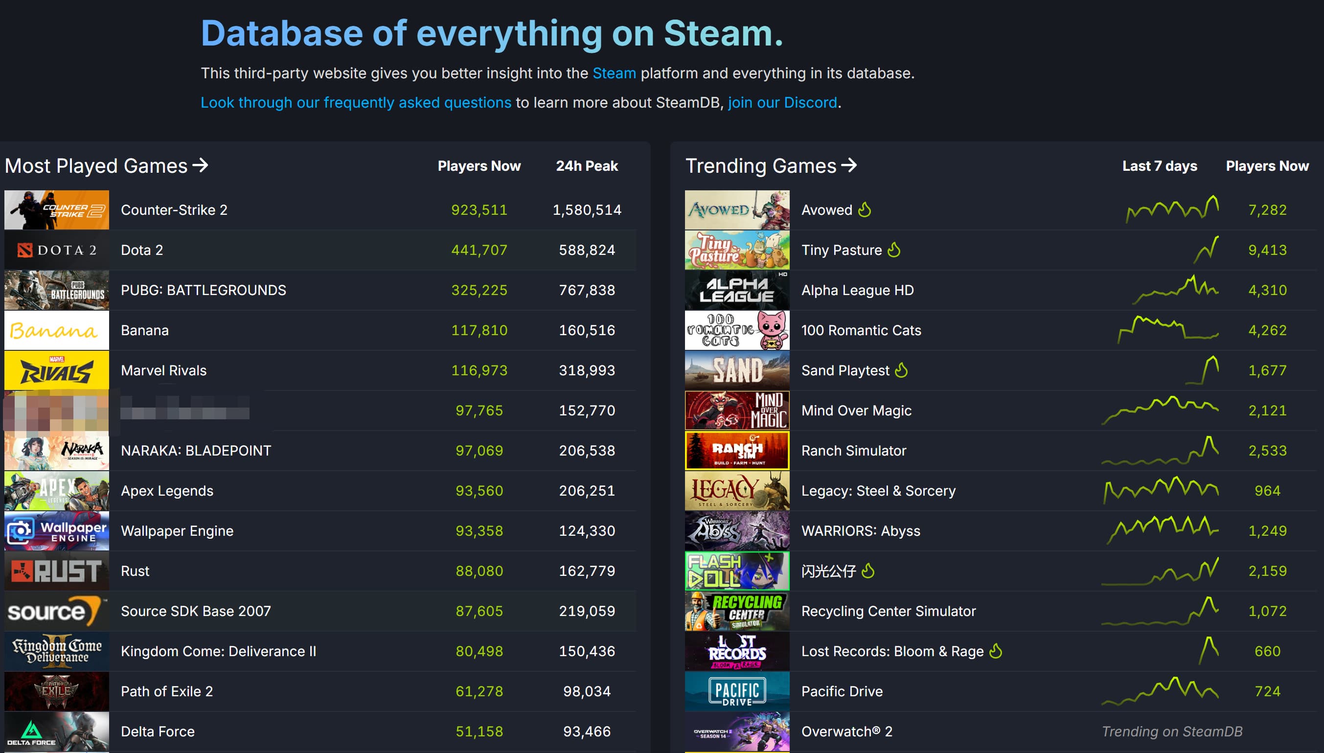 为了更方便统计数据,steamDB(https://steamdb.info/ )作为最大的统计steam各类数据(如热门榜畅销榜,下一次打折节,打折天数,折扣力度等等)的第三方统计网站,这里会引用steamDB的数据来追踪。