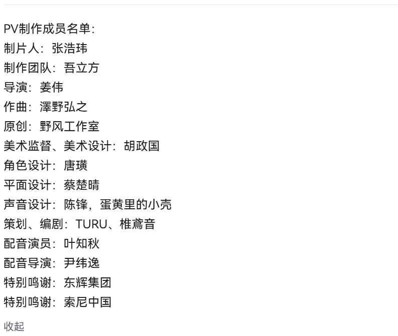 特别鸣谢:东辉集团、索尼中国,东辉集团是前文提到的南京野风网络科技有限公司控股30%的股东(剩下70%的持有者即为制片人张浩玮),至于索尼中国,则尚不清楚其中的关系(猜测或许和中国之星项目有关?)