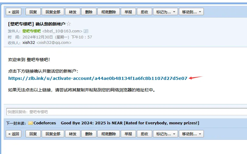填写完成后,论坛系统会自动向您填写的电子邮件地址发送一封邮件,请您点击邮件中的链接,完成注册