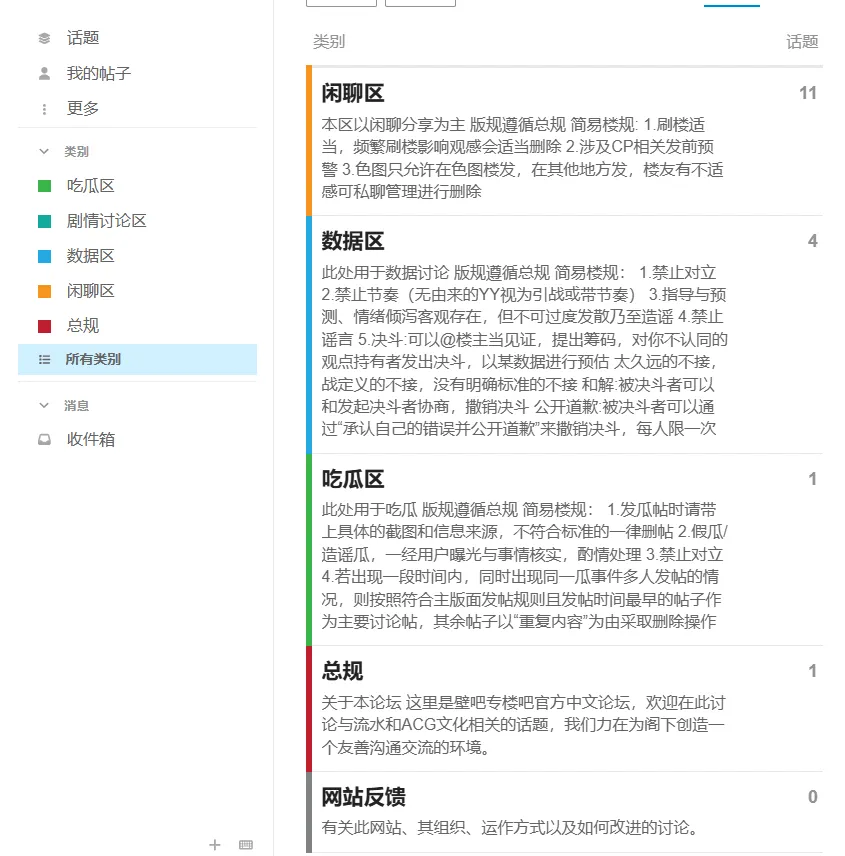 当前社区分成了六个区,其中总规区是发布版规的地方,其余的就是四个主要的讨论区