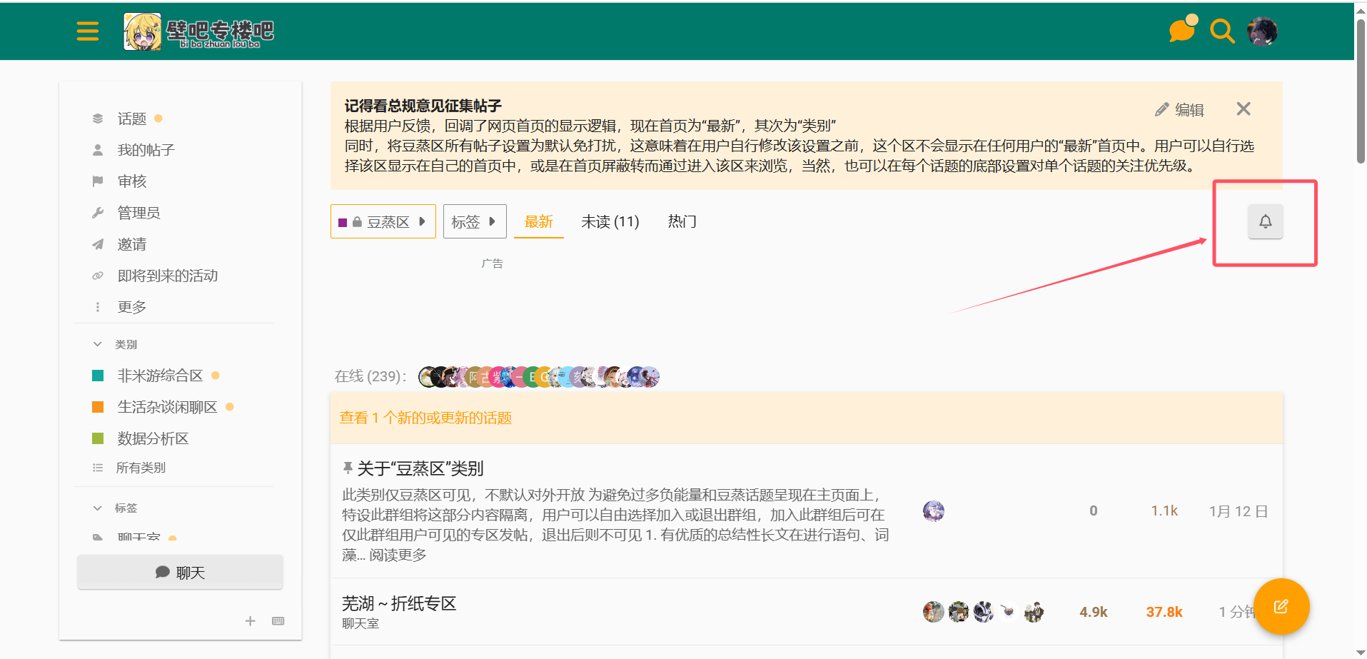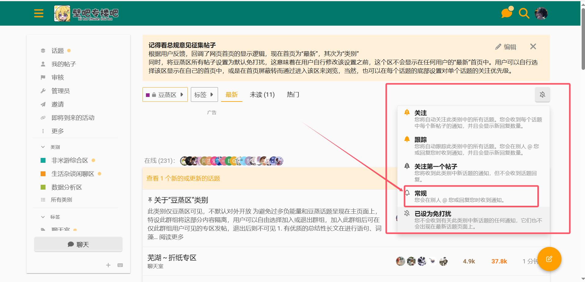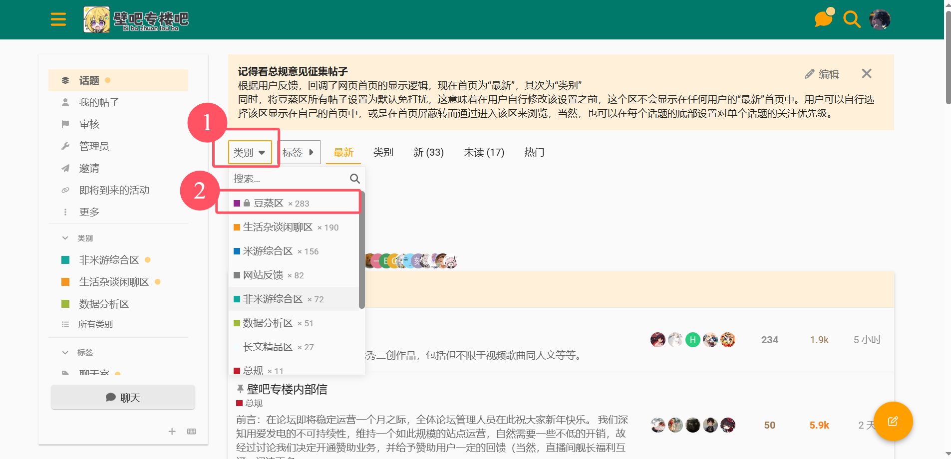 今天修改了豆蒸区显示逻辑,现在默认为免打扰,导致部分用户找不到豆蒸区或不会开启。做个简单的图文实例。 在【话题】页面点击【类别】,选择【豆蒸区】点击进入。