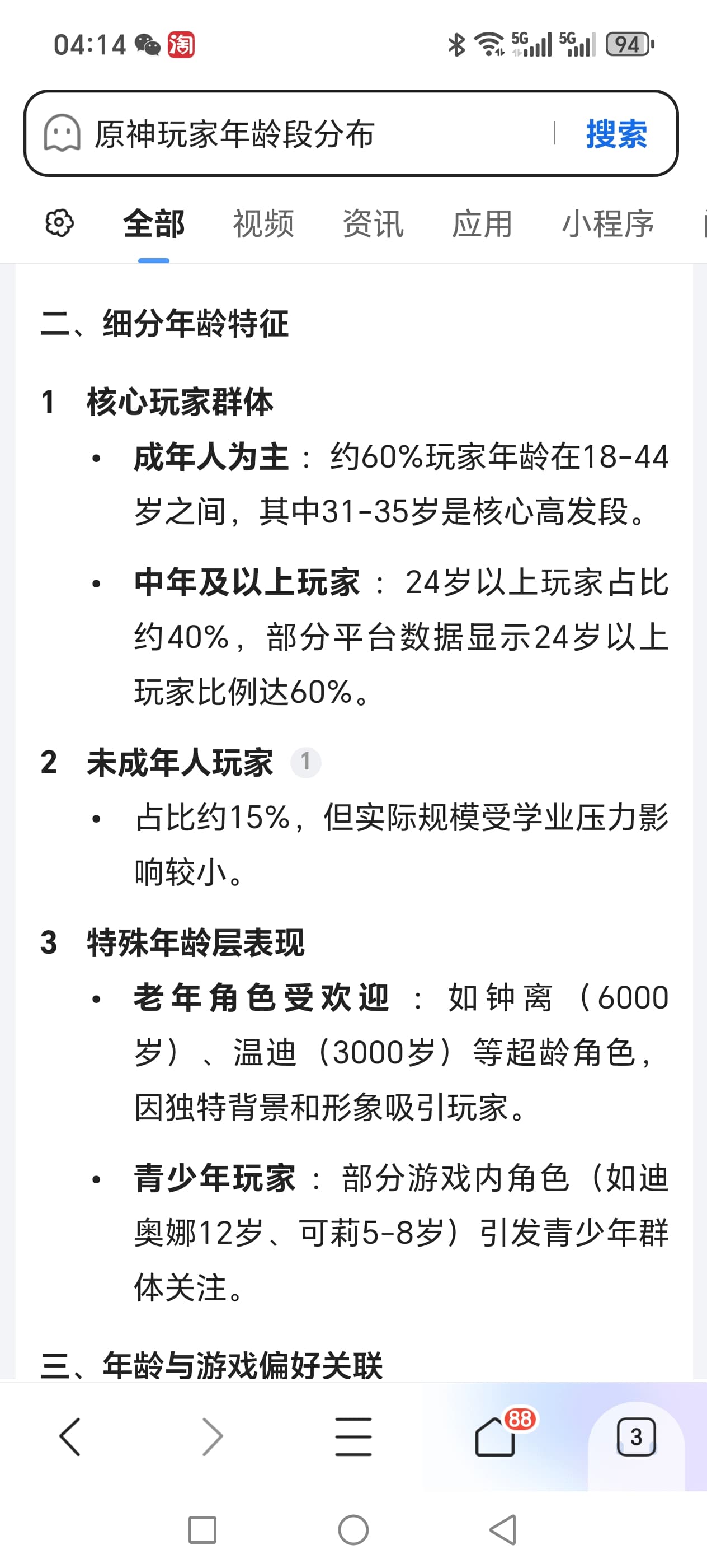 我个人体感上原神玩家年龄分布除了在大学生这个年龄层有高峰外,其他年龄分布是比较均匀的,工作了的多,小孩也不少