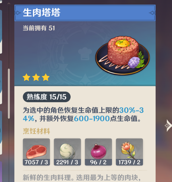 回复类可以选这个,材料基本上都是日常挂远征给的,就一个洋葱需要去杂货店买,蓝色回复比绿色的好一些。获取是枫丹的声望等级。
