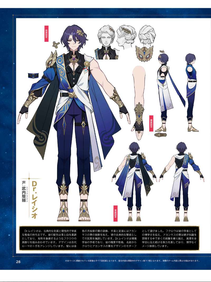 真理医生有古典的气质和理性率直的性格。他的配色以蓝和白为基调,搭配了象征智慧的猫头鹰肩饰。设计灵感来自古罗马的托加长袍。头发上有金色的月桂树叶作装饰,手腕和脚踝上有茛苕叶,这些古希腊常见的装饰图案凸显了他作为一位古典智者的气质。真理医生是一位博识学会的学者,从他的职业、性格、名字中选择了猫头鹰和茛苕叶作为设计主旨。猫头鹰表达了他作为学者的博学,茛苕叶表现他在学习知识的过程中克服重重困难,努力将真理播撒向整个宇宙,展现了他博学的形象。