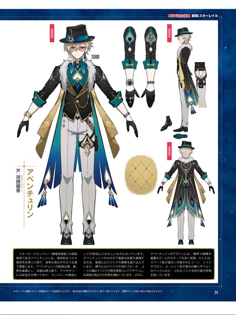 星际和平公司"战略投资部"的高层砂金,是一名典型的风险爱好者,在游戏中以华丽的贵公子形象登场。砂金的配色以黑、蓝、绿为基调,衣服为绅士风格,饰品由砂金石制成,与他身为公司高层的地位相称。为了表现砂金夸张而高贵的气质,他的服装中融入了孔雀的元素。砂金的帽子上的孔雀羽毛饰针和衣服下摆参考了孔雀尾羽的设计,营造出一种时尚贵公子的形象。此外,砂金的设计中引入了大量以"概率"游戏为主题的图案,例如带有黑桃形镂空图案的外套、衬衫和裤子、轮盘形状的背部装饰和皮带扣等,都体现出他喜爱冒险的特征。