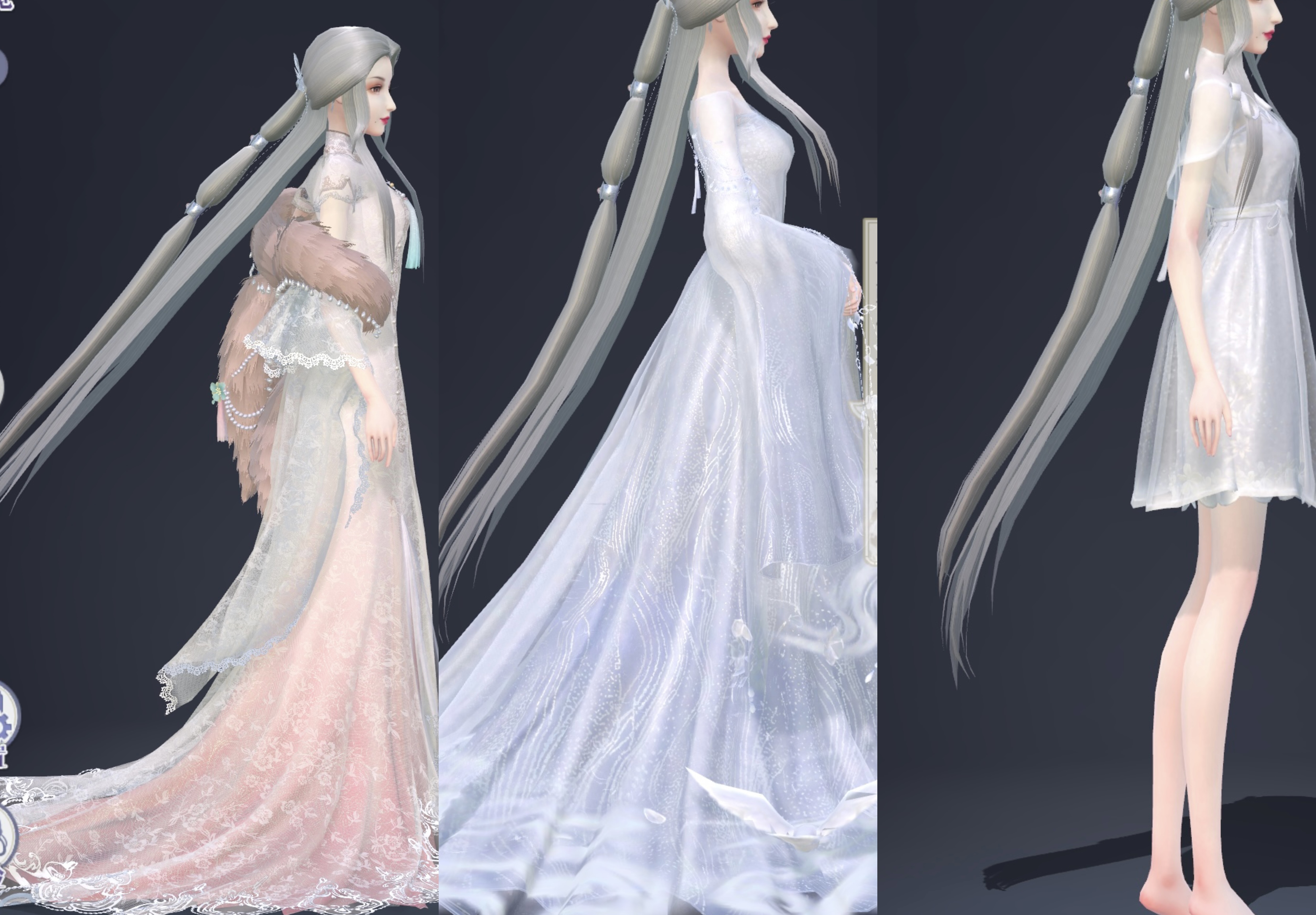 头发是否起飞应该也和人物动作有关,最左边长裙是一个叉腰动作,头发就起飞了,中间大裙子的前身叉手和最右无服装的垂手初始动作就没有这种现象。当年叠玩家最喜欢拿小云的钢板头发挑刺,这次无暖算不算回旋镖呢![]()
