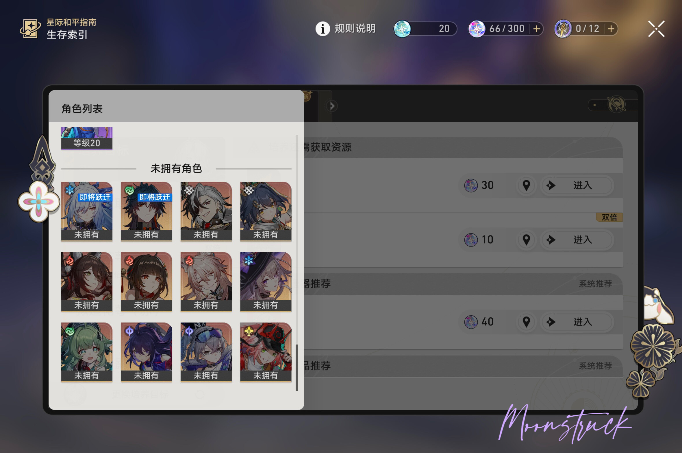 补一下现有角色的抽取情况,小号没下过光锥池,大号抽了0+1的有景元阮梅黄泉星期日,基本上以丰富角色BOX为主,练度一般但三路深渊凹一凹差不多都能满。