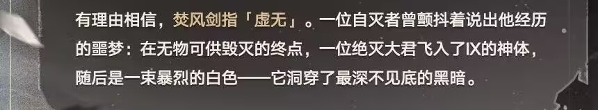 而达成这一结局的关键钥匙,正是毁灭的终极兵器:焚风。当一切存在都被毁灭所统合,焚风便能代表整个【存在】派系在宇宙终点洞穿虚无,以完全的毁灭实现"存在"与"无"的同归于尽——这正是他作为反虚无兵器的最终使命,也是均衡所追求的完美相抵。