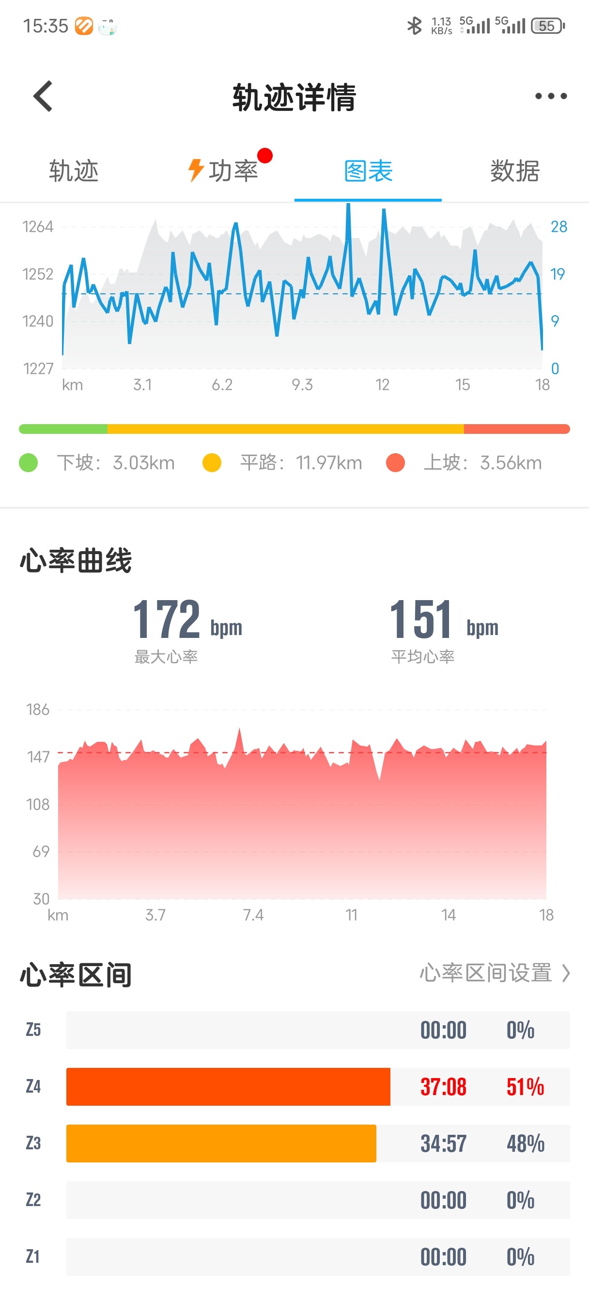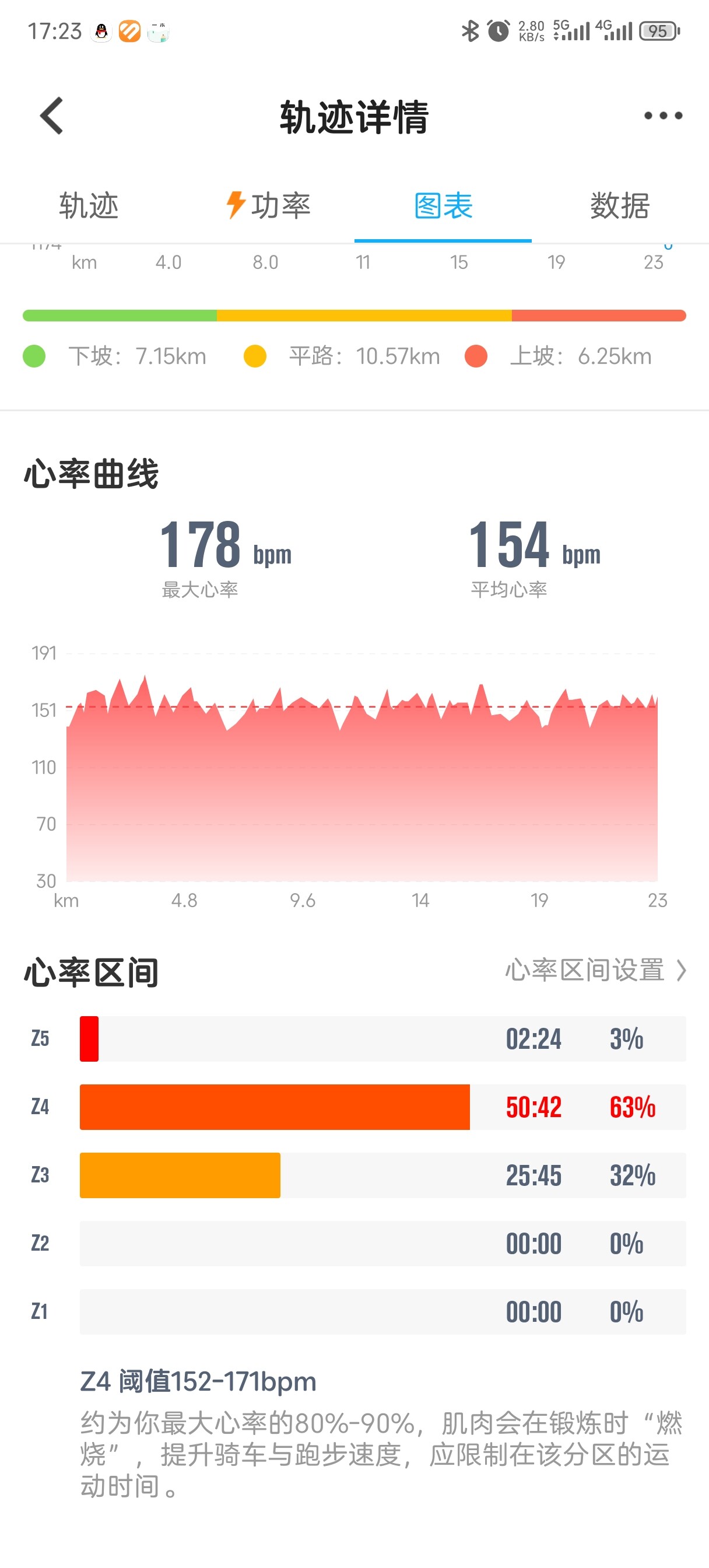 早上骑行心率还是偏高的,有氧只能占40左右,剩下全在阈值,下午倒是好多了,有氧占比60%,身体也开始适应了,挺好