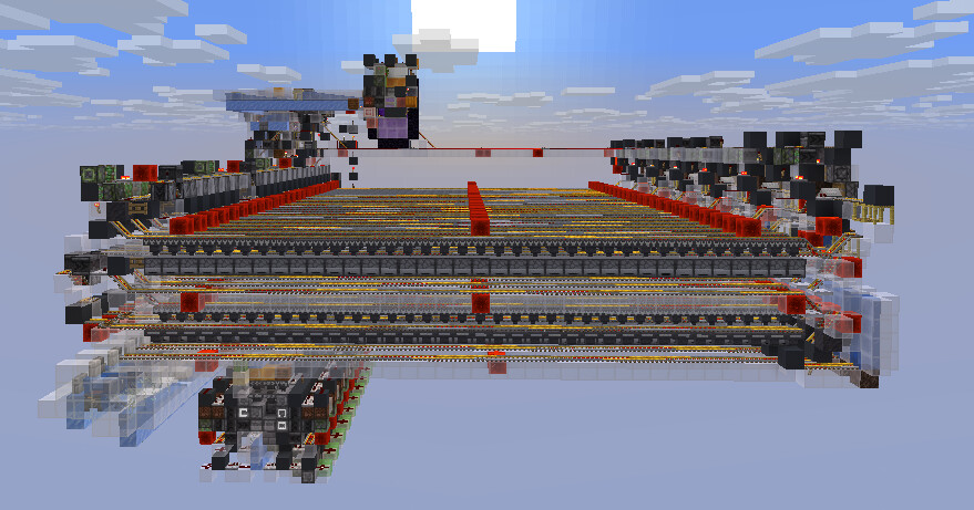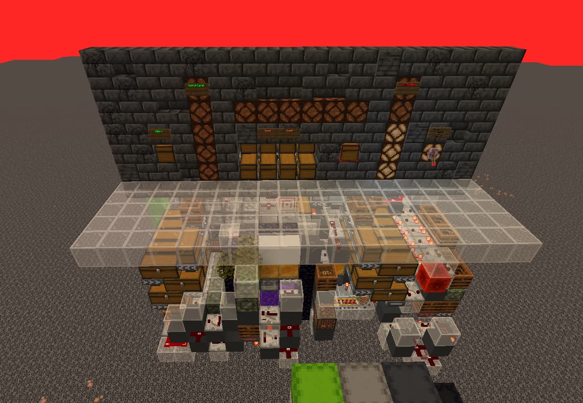 油管找到一款挺有意思的1728,双维度设计,面板非常简洁,还有我最喜欢的指示灯。加载器、烧制物分配和打包机全是第一次见的设计,把一盒1728物品均分成24*72太妙了。虽然没有白名单,也不支持散货输入,但我老的320也没打算拆,轻度的需求就还是用老的解决就好了,这台1728就专门用来处理大量烧制物,太符合我的需求了。因为优化模组管够的缘故,即使熔炉组基本没锁几个漏斗,满载卡顿也就十几mspt,跟2880不相上下,我又不是什么服务器玩家,完全可以接受。而且这款的耗材就算乘以二也比不上上面的任何一个啊。就决定是你了。