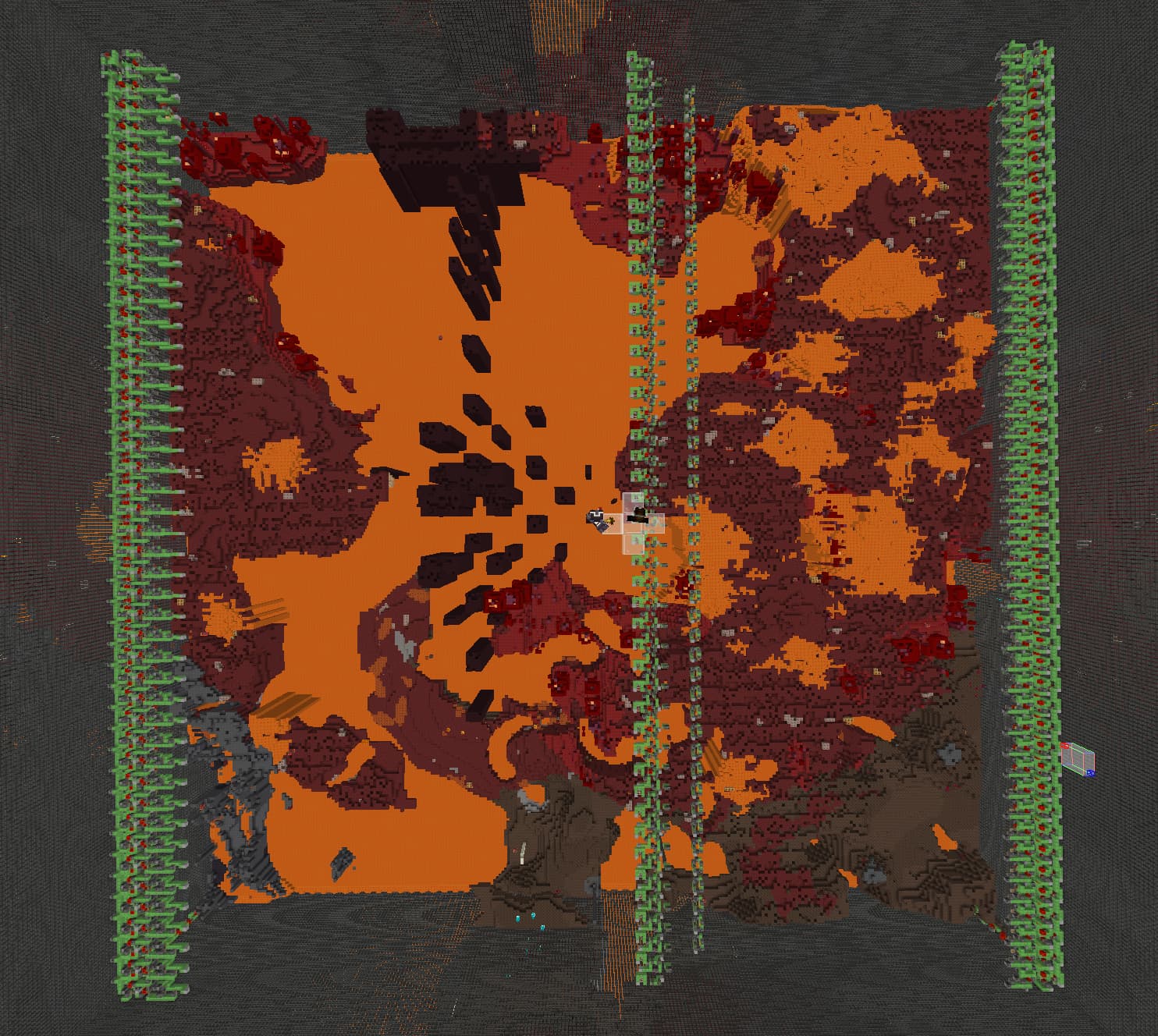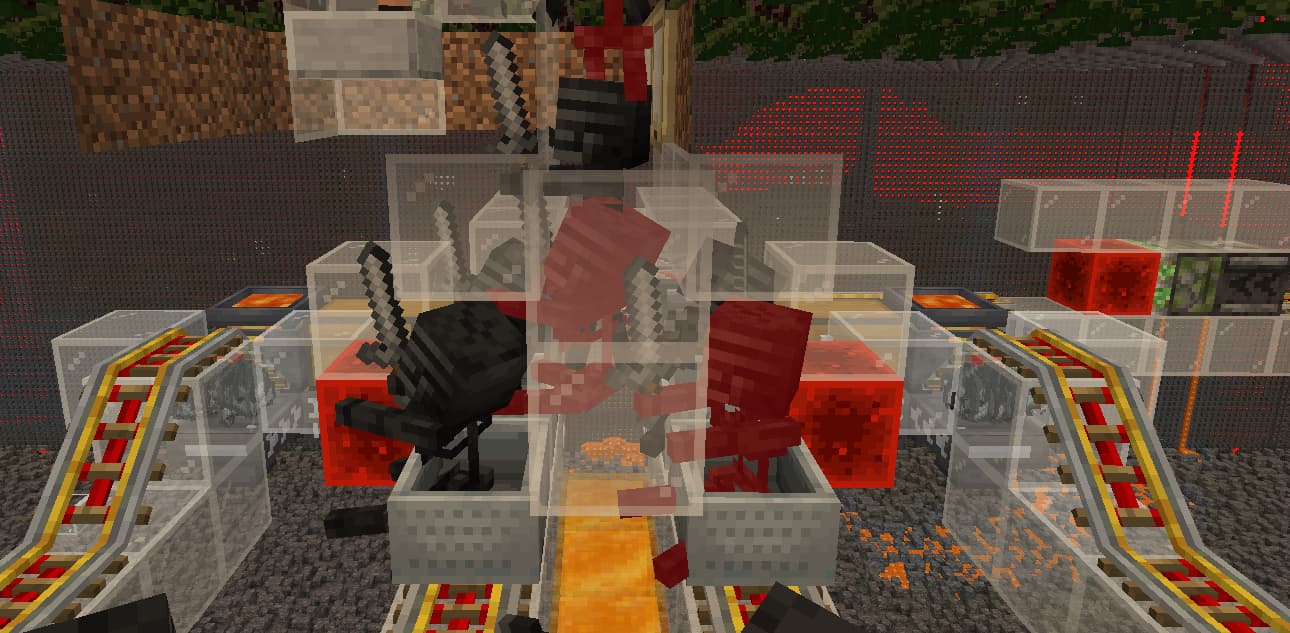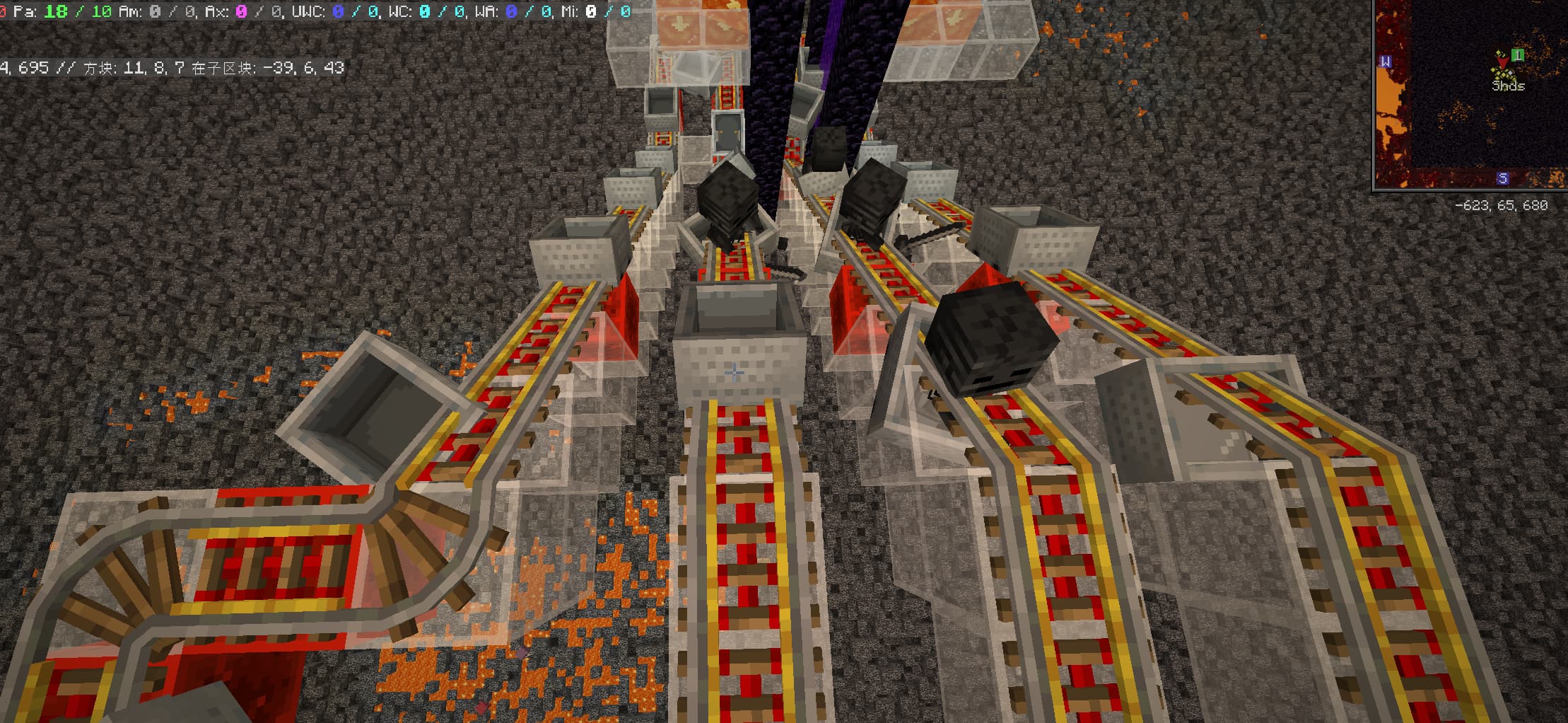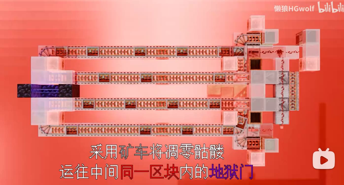 把活塞链传送带换成了矿车接送。参考的原设计使用的是开启后有限数量的矿车以4gt发车,然后在闭合的环形铁轨中循环;关闭后矿车发车会被锁住,轨道转向仙人掌烧车收集。仙人掌烧车我测下来不知道为啥每次会漏一两个,不是很稳定;地狱门的结构也不允许我做简单的对称结构铁路,这就导致矿车之间的间隔有较大概率乱掉,从而卡住所有的矿车。索性放弃铁轨循环,统一使用岩浆锅烧车收集再从发射器统一发车,这样就相当稳定了。