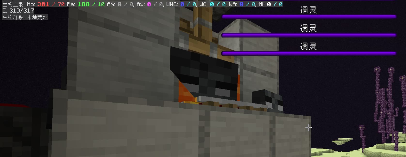 主世界/下界要开关坚守者伪和平的话无论如何都要强加载一下,常态卡顿也不算低,挂坚守者更是开tick加速都嫌慢,唯一的好处也就是没啥资源消耗;相比之下末地实在是太方便了,常态卡顿不高,有折跃门可以快速移动,地形也决定了有些地方可以完全不用去,把伪和平做在这种地方用折跃门加载开关就完全不会卡了。在想要不要把其他维度的伪和平也换成凋灵试试。这玩意确实好东西,以后还是尽早做掉省事。