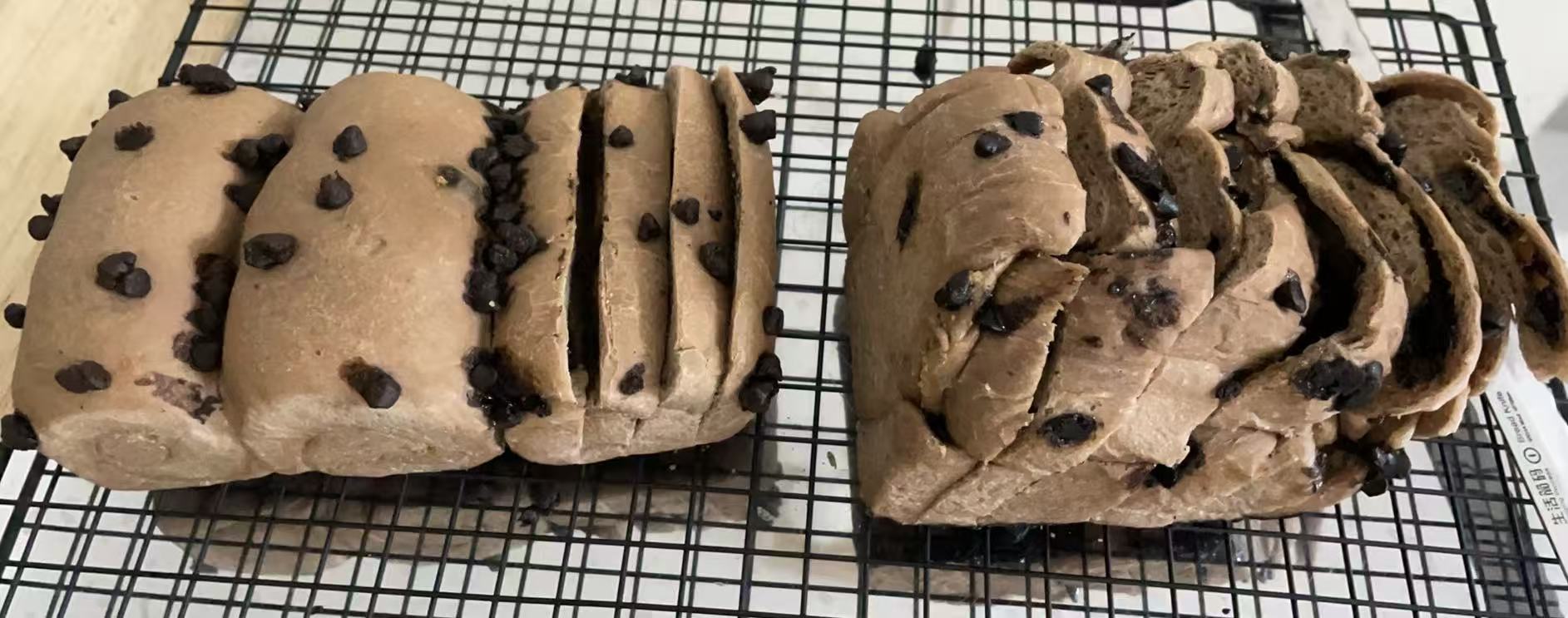 做的可可巧克力吐司,巧克力豆撒的跟老鼠屎一样。