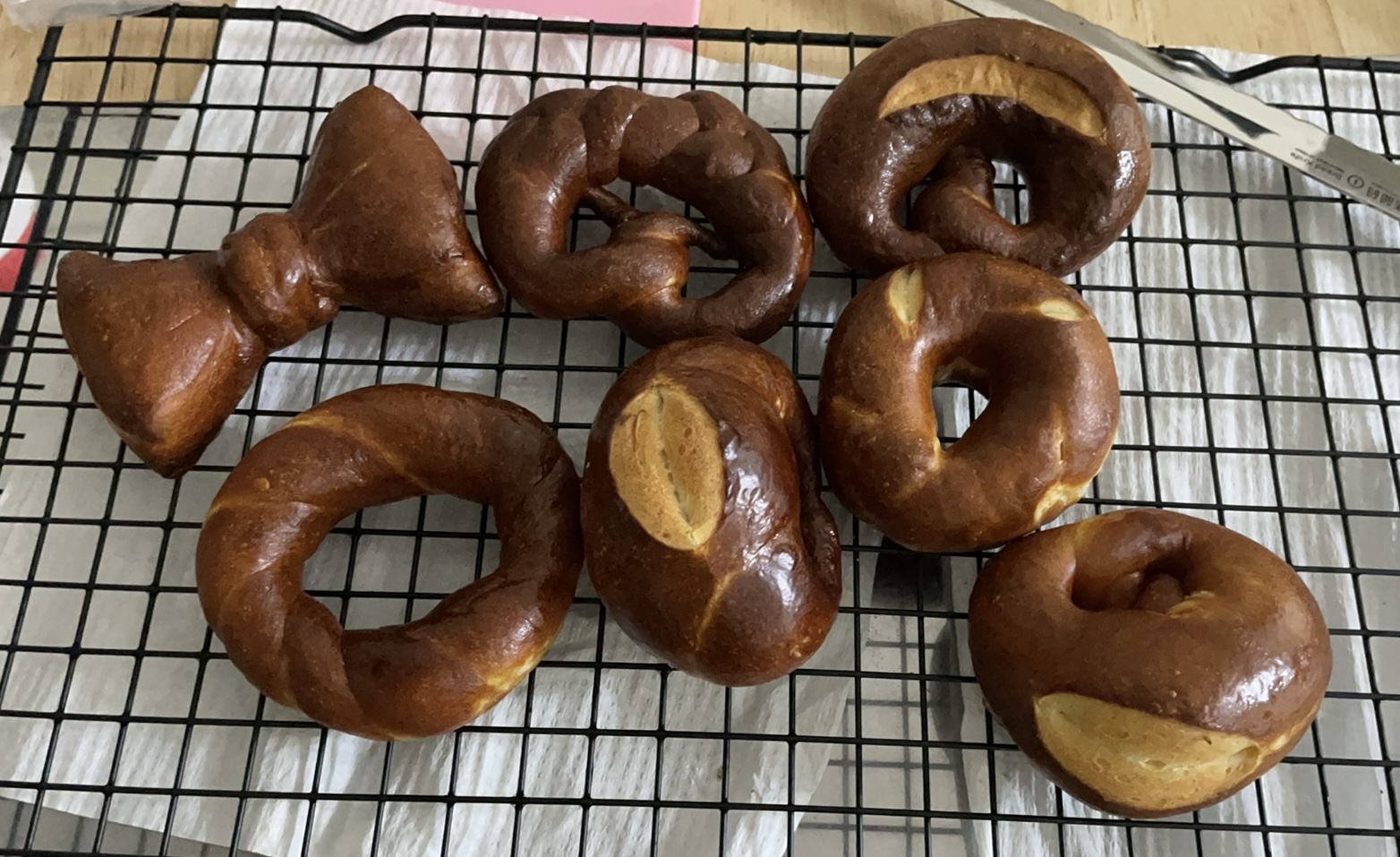 酵母有点放多了,开始提前发酵导致成品不够劲道,脆硬的外壳下面是比较松软的组织。不知道是烤箱温度高了还是碱水泡久了,成品颜色偏深。