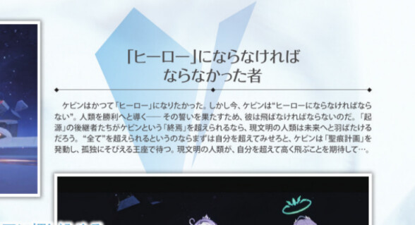 凯文曾想成为英雄。但如今,凯文「必须成为英雄」。为了履行引领人类走向胜利的誓言,他必须振翅高飞。倘若「始源」的继承者们能够超越凯文这个「终焉」,现文明的人类必将能够展翅飞向未来。若宣称要超越「一切」,就要先证明能够超越自己——怀着这样的信念,凯文启动了「圣痕计划」,在孤高的王座上静候。期待着现文明的人类,能够超越自己飞向更高远的苍穹。