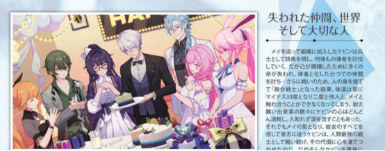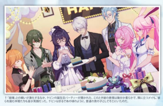 ↑就算与「崩坏」之间的战斗日益激化,凯文的生日聚会也如期举行。这时他的表情依旧带着些许温柔,站在他身边的梅和包围着他的伙伴们也都面带笑容。凯文仿佛又回到了过去,作为普通的男子置身其中。