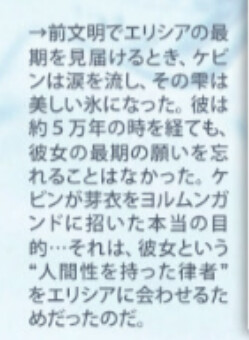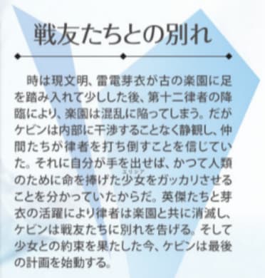 →在前文明见证爱莉希雅逝去之时,凯文流下的泪水凝结成了美丽的冰晶。即便历经五万年的时光,他也从未忘记她最终的愿望。凯文邀请芽衣进入世界蛇的真正目的……正是为了让身为“拥有人性的律者”的她,与爱莉希雅相见。