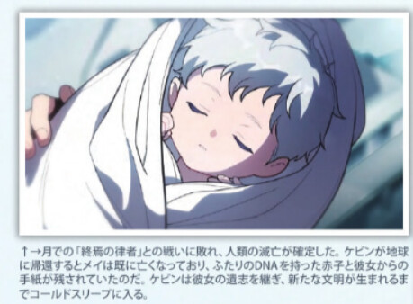 ↑→在月球与「终焉之律者」的对决中落败,人类灭亡已成定局。凯文回到地球时梅早已死去,只留下有着两人DNA的婴儿和她所遗留的信件。凯文继承了她的遗志,在新的文明诞生前进入了冷冻休眠。