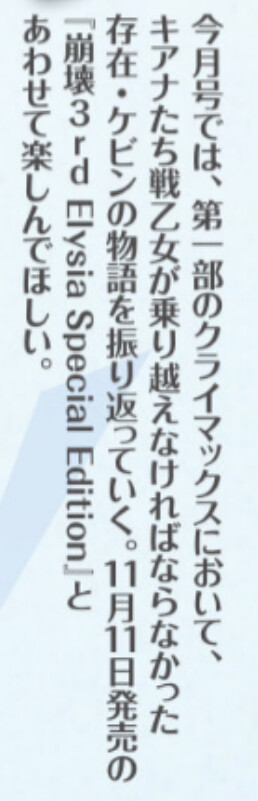 本月的刊物中,我们将会回顾第一部的高潮中,与琪亚娜等女武神们必须超越的存在·凯文的故事。于11月11日发售的「崩坏3rd Elysia Special Edition」也敬请期待。