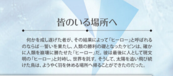 若达成伟业者因其功绩而被作「英雄」……那么践行誓言,为人类胜利奠定基石的凯文,确实是引领人类战胜崩坏的「英雄」。最终他以人类之姿面对现文明的「英雄」之名,将世界托付于她。至此,那只永远追逐太阳的飞鸟,终于得以回到能让羽翼休憩的归所了。