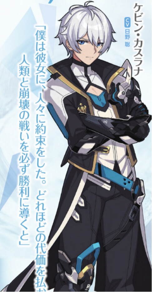 曾经的凯文也像琪亚娜他们一样,是爱着平凡日常的人类之一。与朋友畅谈远大的梦想,想引起心仪之人的注意,参加喜欢的歌姬的演唱会……天真烂漫,率真也带有些许可爱之处。他本来应该是那种随处可见,平凡无奇的男子高中生。然而「崩坏」夺去了他的日常,凯文最终投身于战斗之中。