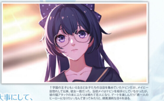 ↑凯文几乎可以称得上是学园的王子,深受女生们的注目,但自从对梅一见钟情后,目光便只停留在她身上。最开始梅并没有将凯文当做交往对象,但在凯文猛烈的攻势下,两人最终成为恋人,享受约会,说着「我想成为你一个人的英雄」这样的话,过着一帆风顺的日子。