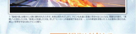 ↑「圣痕计划」确实能为人类带来胜利,但代价是失去未来。这是个残酷的计划,凯文也将永远承受痛苦的折磨,三位肩负众人希望的少女——羽化登临「真理」的少女、抵达「始源」的少女,继承「英雄」之名的少女,为挑战命运,守护美好世界,毅然向凯文发起挑战。
