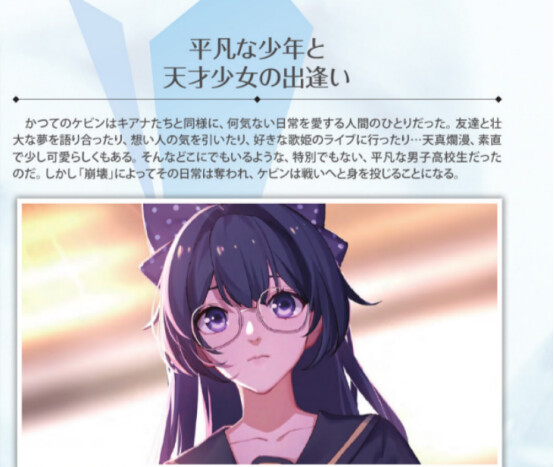 ↓→与恋人和朋友一起度过的时间对凯文来说十分重要。但是某一天,凯文和梅被大崩坏卷入……不,是梅被对崩坏组织「逐火之蛾」接走了。组织需要的是作为天才的梅的头脑。于是,凯文为了追上她而决意加入组织。