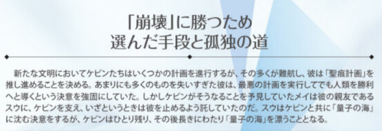 在新文明中,凯文等人推进了多项计划,但其中多数进展艰难,他因此决心推行「圣痕计划」。失去了太多太多的他,坚定了即便执行最残酷的计划也要引领人类走向胜利的决心。而早已预见凯文会走上这条道路的梅,曾托付他的挚友苏去支持凯文,并在必要时阻止他。苏虽决心与凯文共同沉入「量子之海」,但凯文选择独自留下,此后再「量子之海」中漂流了漫长岁月。