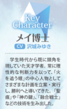自学生时代便开始崭露头角的天才学者。经常以理性为基础做出判断。作为「逐火之蛾」的核心人物,策划并执行了各种计划,引导众人走向胜利。发明了「圣痕」「神之键」「融合战士」等技术。