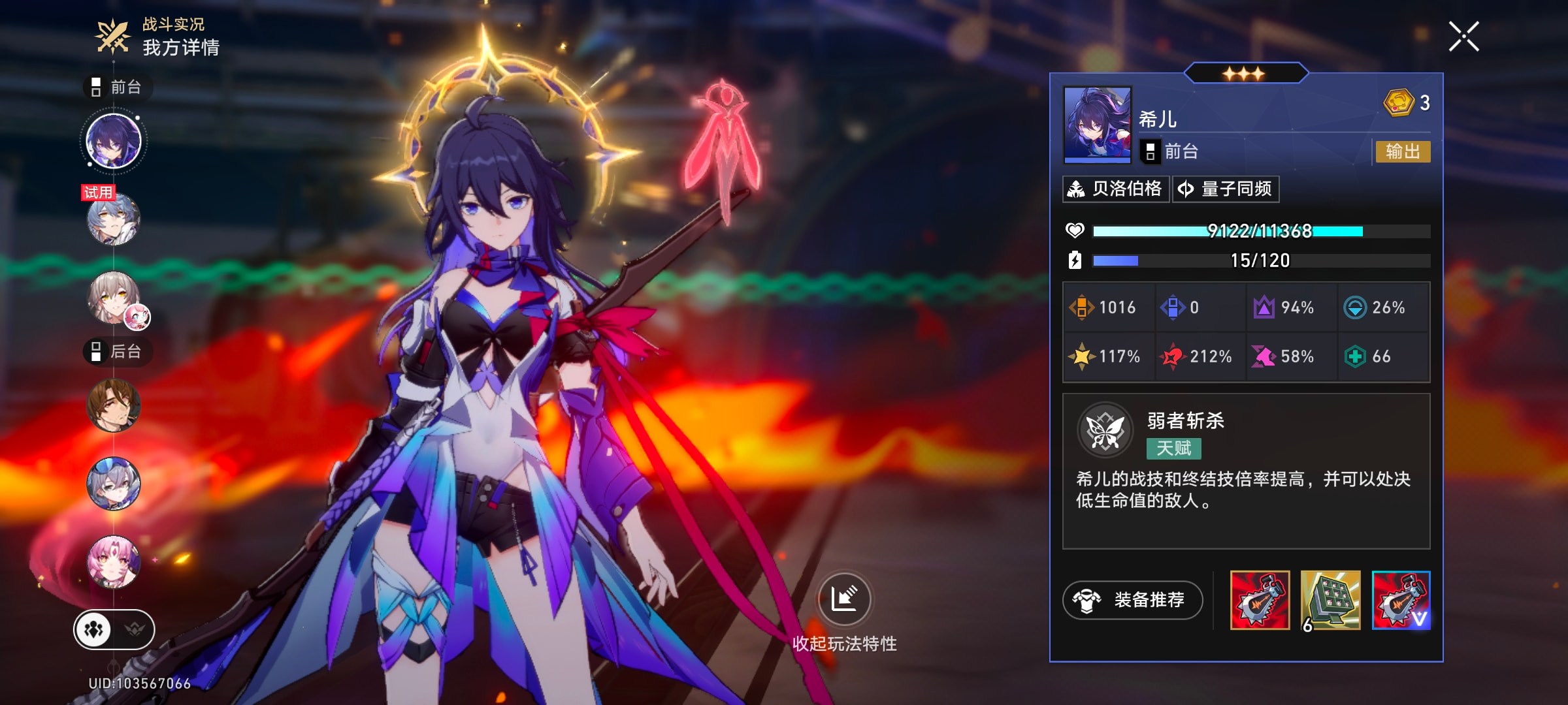 这个阵容刚需老杨,多100行动值能做到进0回合前叠出高速行动值一动的海瑟音。翡翠很重要,后台多动角色也挺重要的,他们单次触发海瑟音伤害能有海瑟音的60%以上。海瑟音靠昔涟给大最好做到一动一大,这样才叠的快,总之是很吃成本的队伍,玩起来还行,有种dot打直伤的感觉