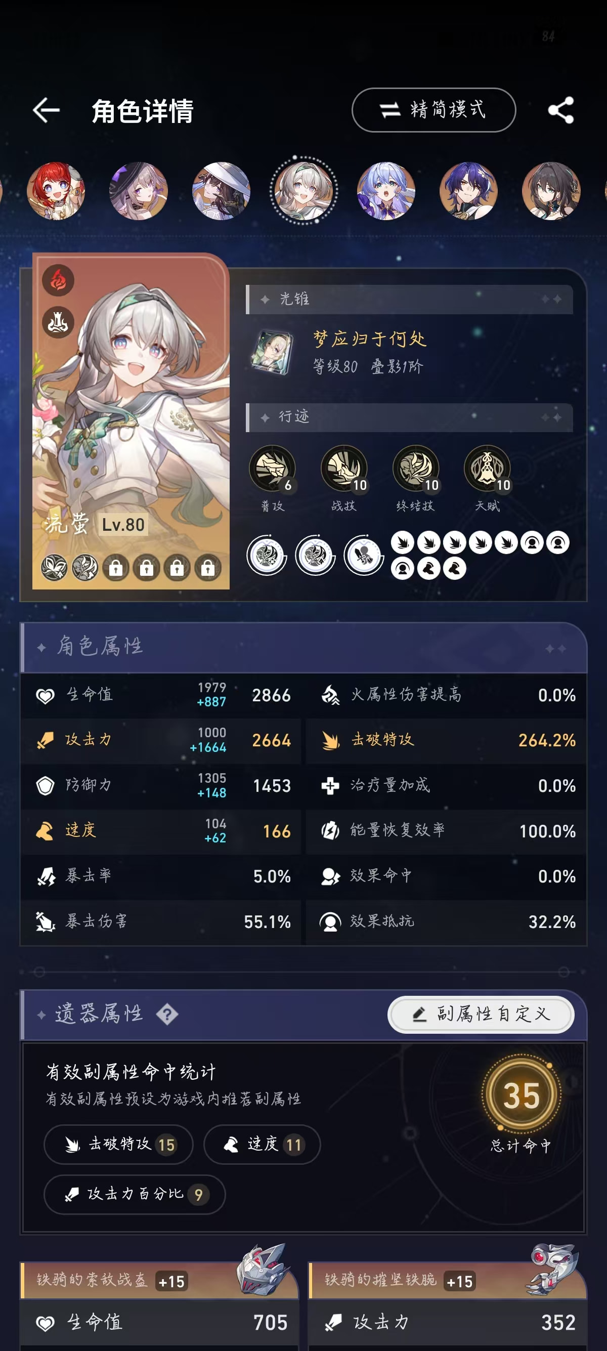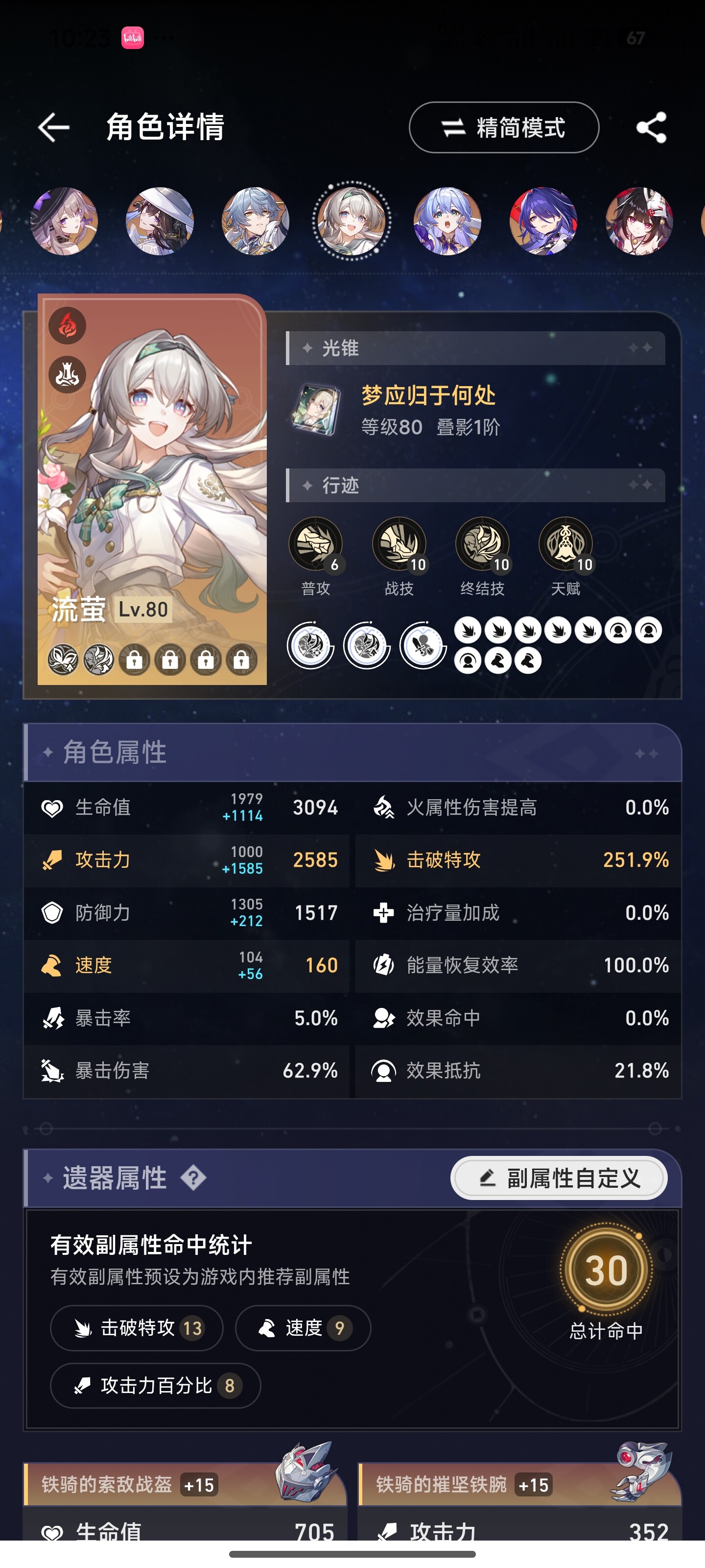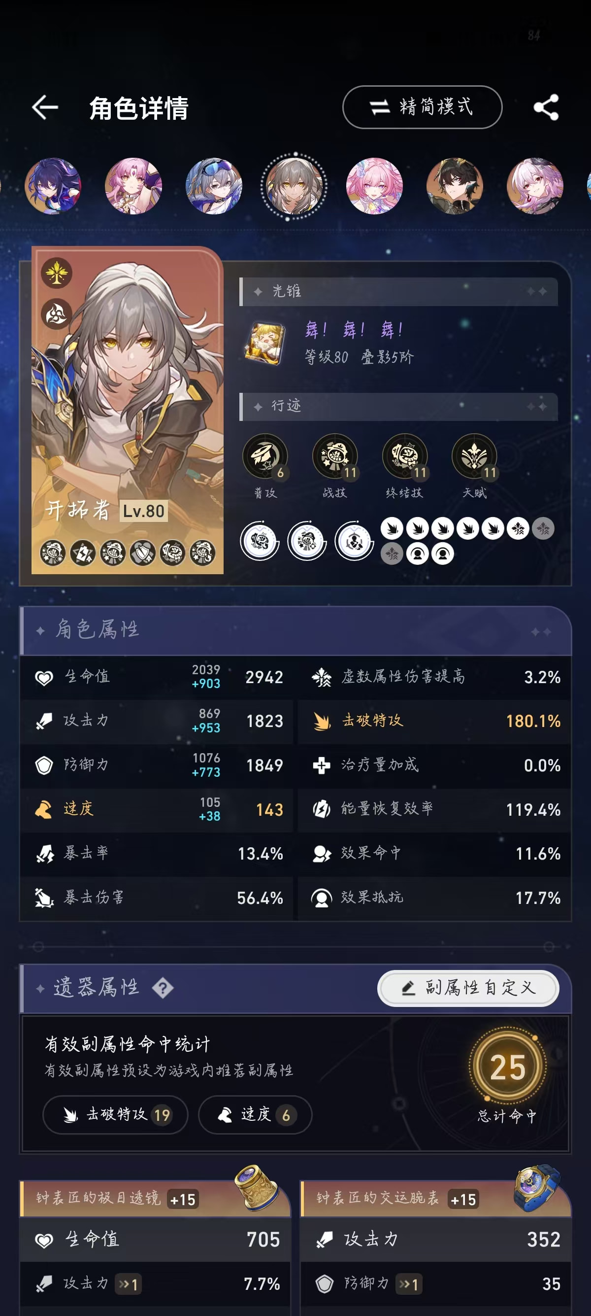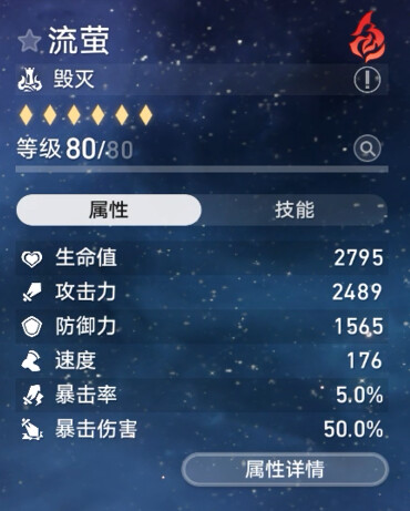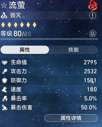 所以流萤可以尝试减少一点速度换击破特攻,速度在146.4以上可以达成两次拉条混沌四动即可。