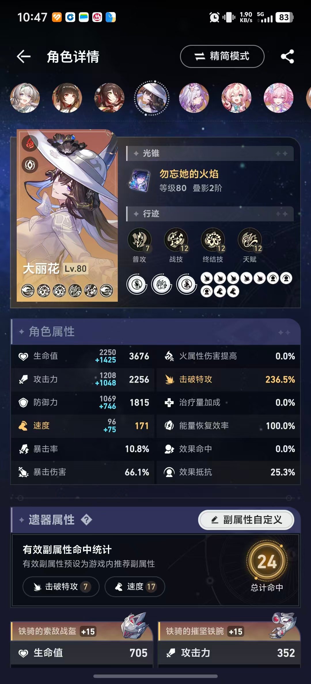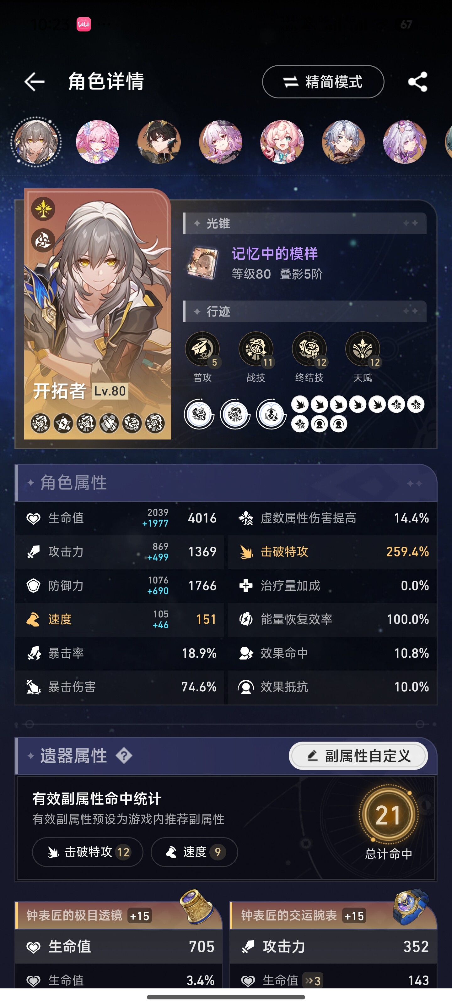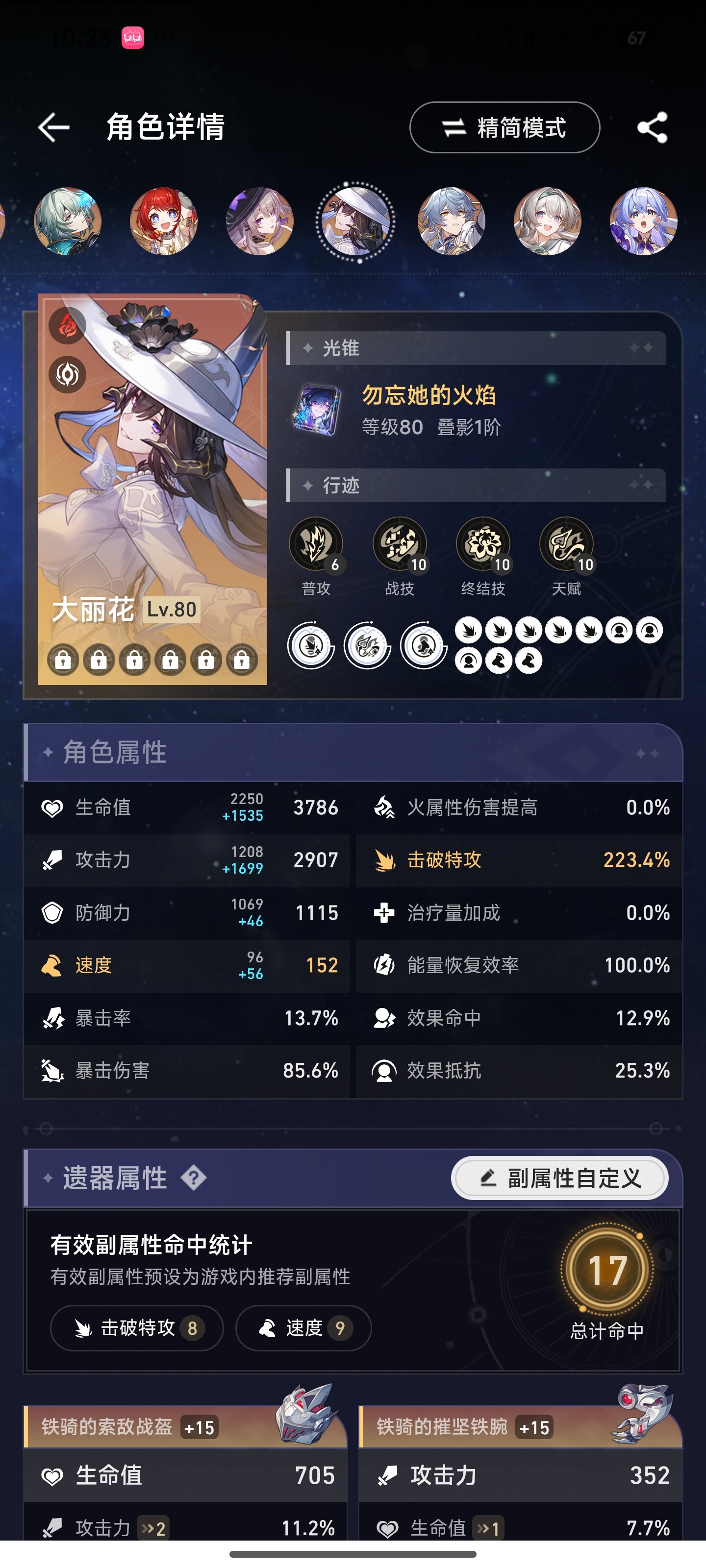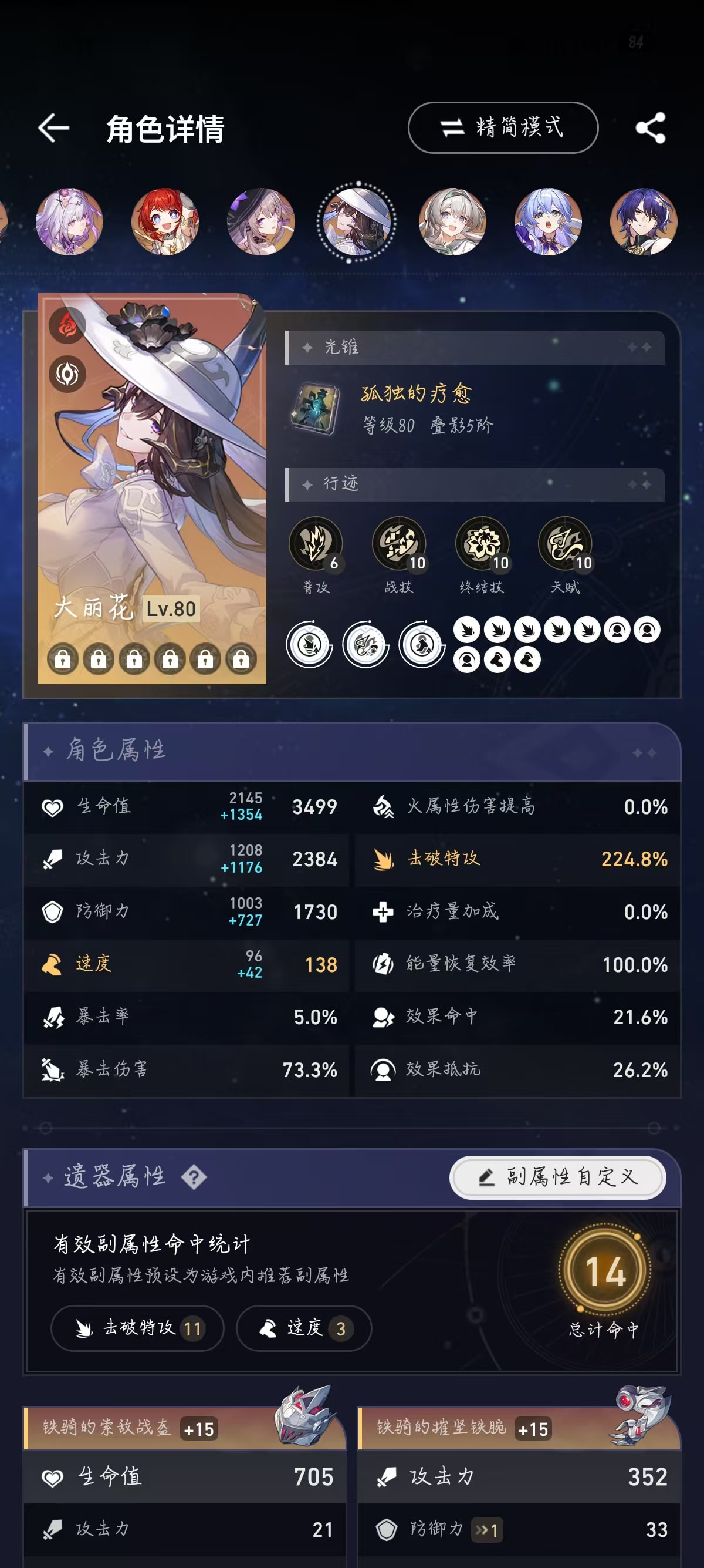 所以流萤可以尝试减少一点速度换击破特攻,速度在146.4以上可以达成两次拉条混沌四动即可。