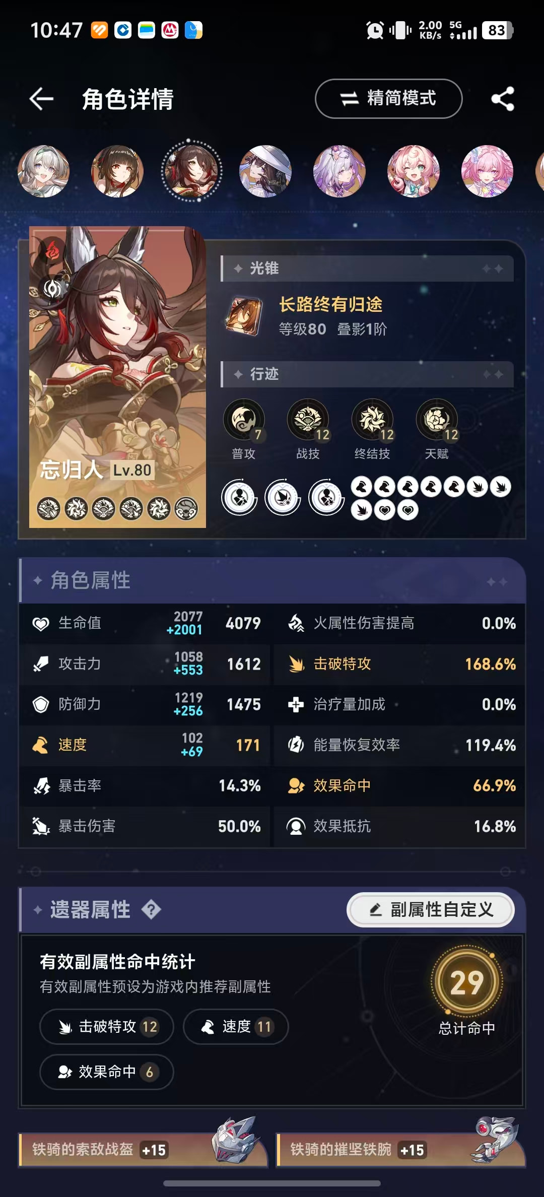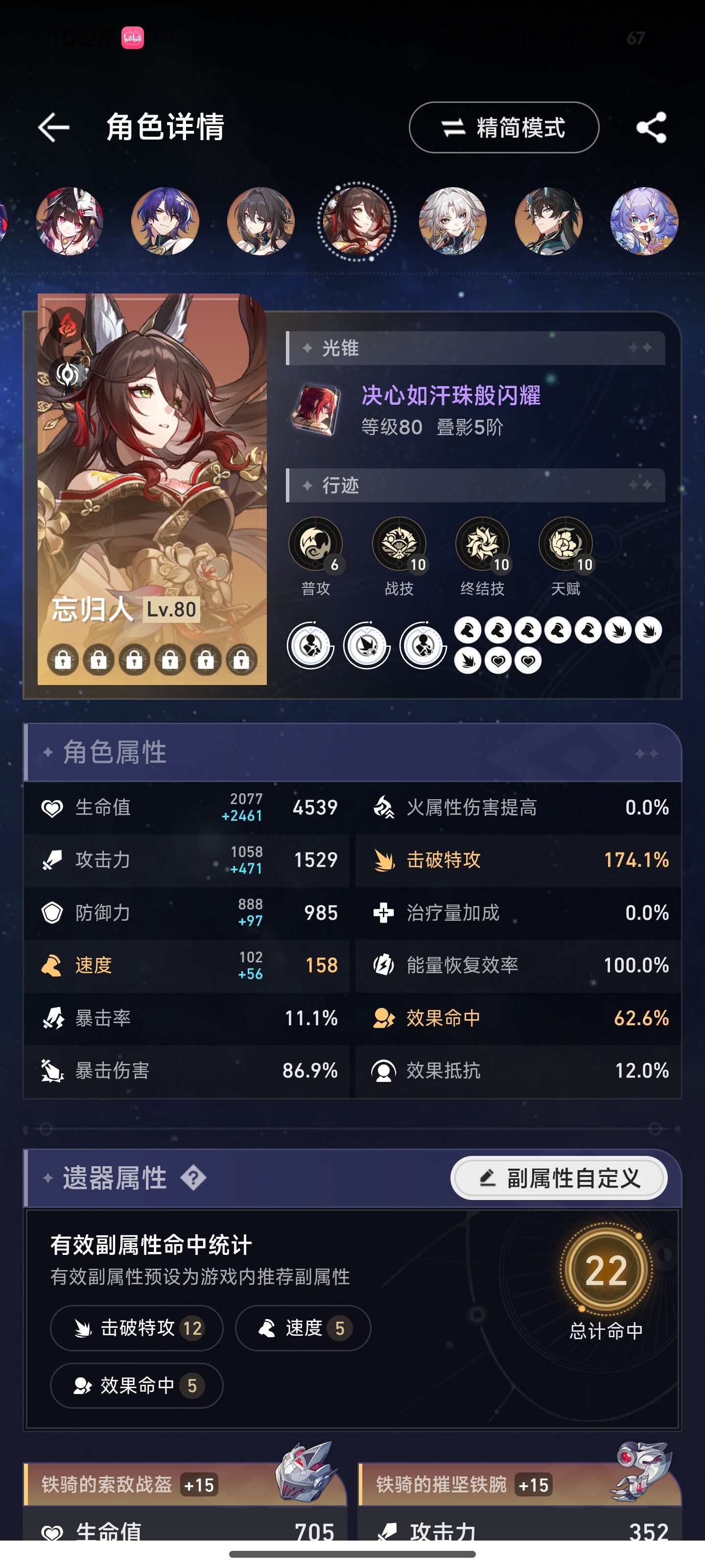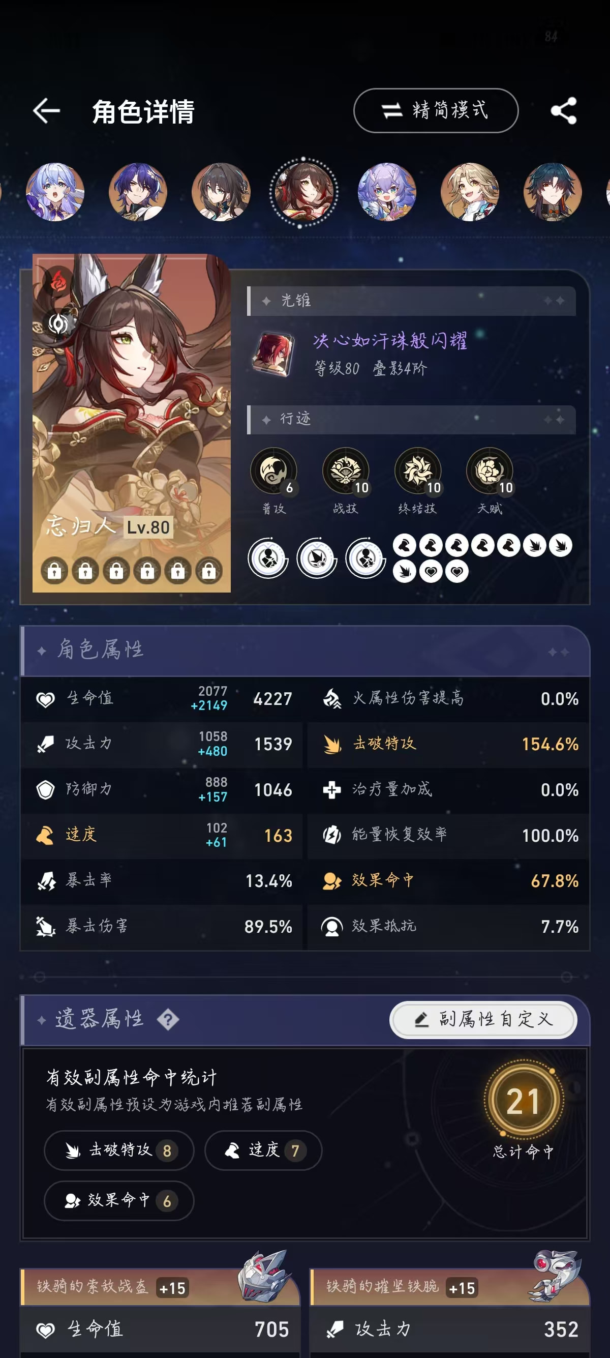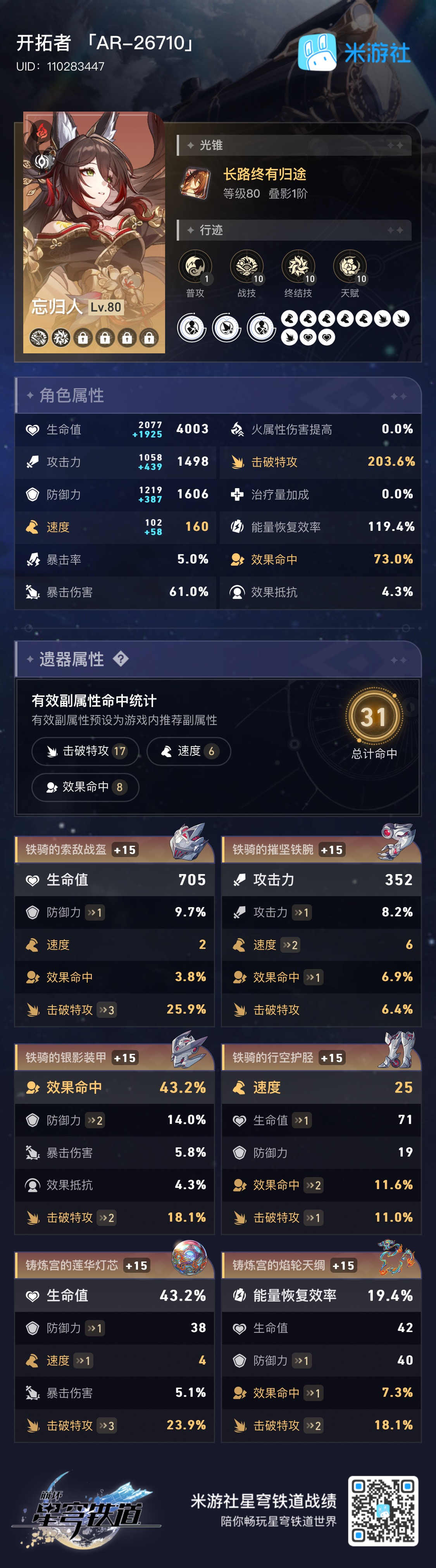 所以流萤可以尝试减少一点速度换击破特攻,速度在146.4以上可以达成两次拉条混沌四动即可。