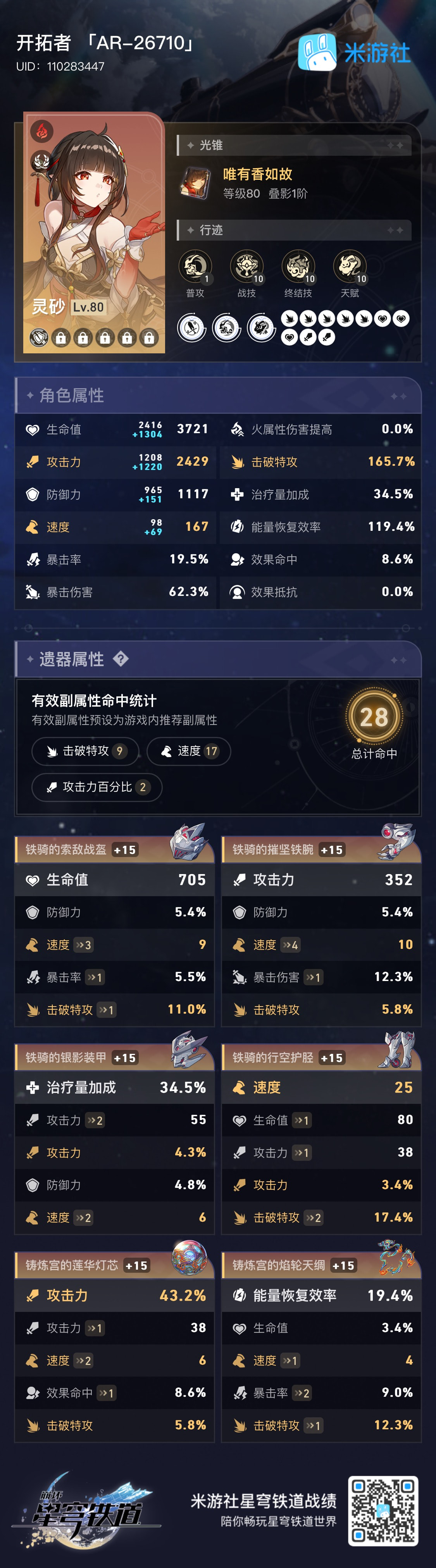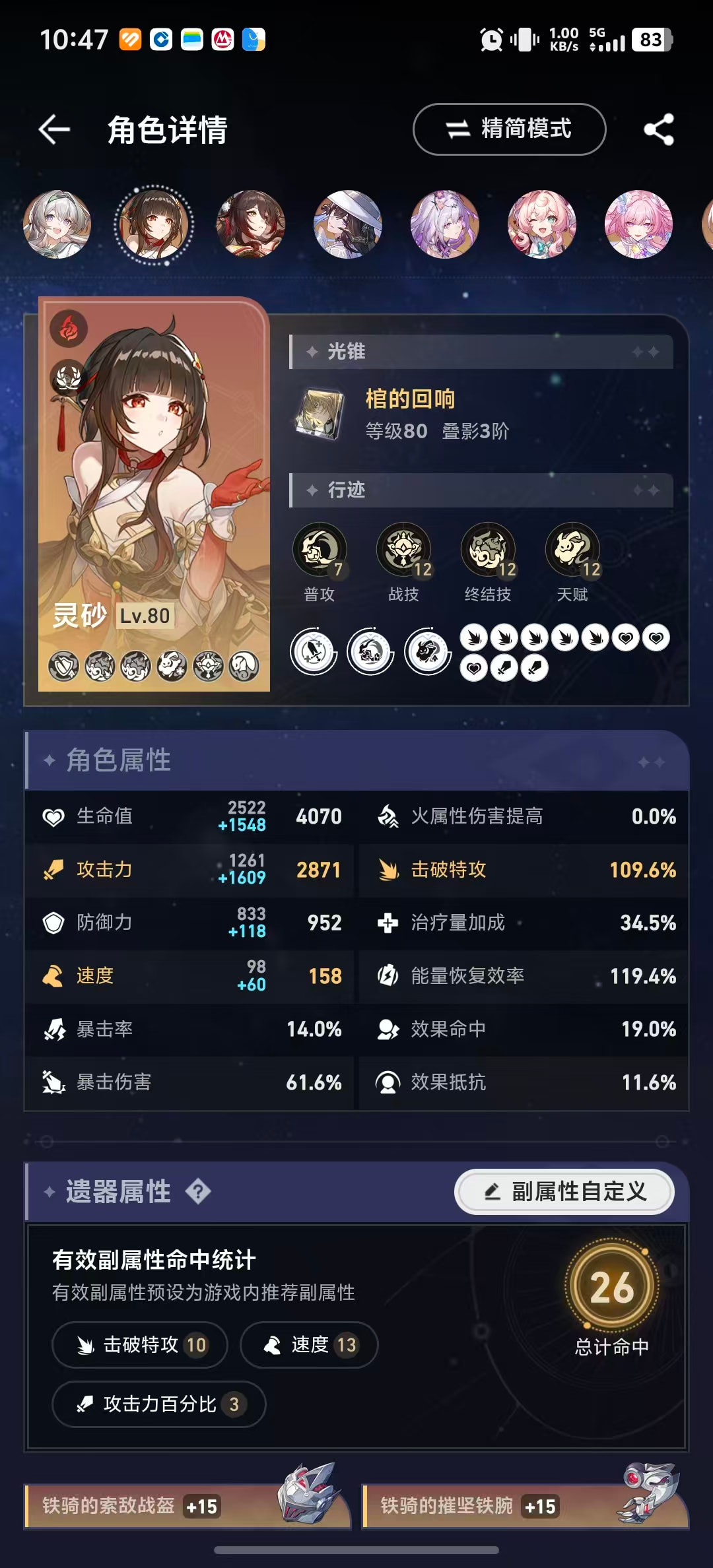 此时流萤无法通过1次拉条达成8动,需要灵砂携带罗专或同谐主携带信使套弥补速度要求;