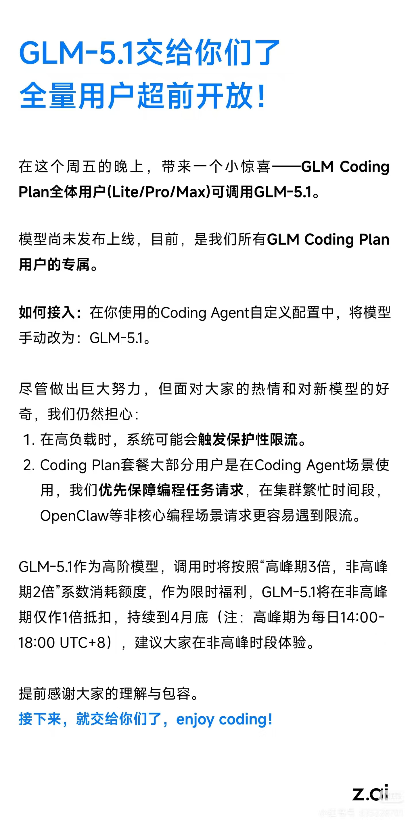 GLM-5.1模型全量用户超前开放,现订阅coding plan的用户均可接入这一款最新模型。