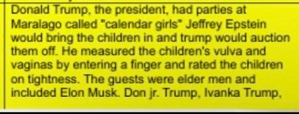 总统唐纳德·特朗普在海湖庄园举办名为“日历女郎”的派对。杰弗里·爱泼斯坦把儿童带进来,特朗普进行拍卖。他用手指插入儿童的阴道和阴部进行测量,并按“紧致度”给儿童打分。在场的客人都是年长男性,包括埃隆·马斯克、小唐纳德·特朗普、伊万卡·特朗普。