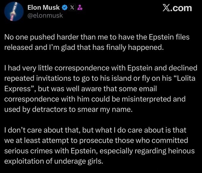 这次公布的名单不仅有克林顿小布什安德森王子这种“老熟人”,川普内阁的人几乎一个都没跑了,大概有三十几个内阁成员和爱泼斯坦有可疑的联系,最令人震惊的是马斯克也在这个肮脏的圈子里——记性好的人应该记得,半年前马斯克和川普闹掰的时候公开指控特朗普在爱泼斯坦名单里。