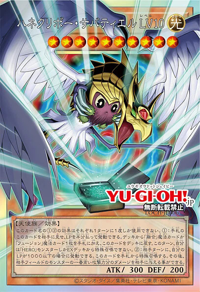 ①: 把手卡的这张卡给对方观看, 支付一半的LP才能发动. 从卡组把1张"融合"魔法卡或"结合"魔法卡加入手卡, 这张卡回到卡组. 这个回合, 自己不是"英雄"怪兽不能从额外卡组特殊召唤.