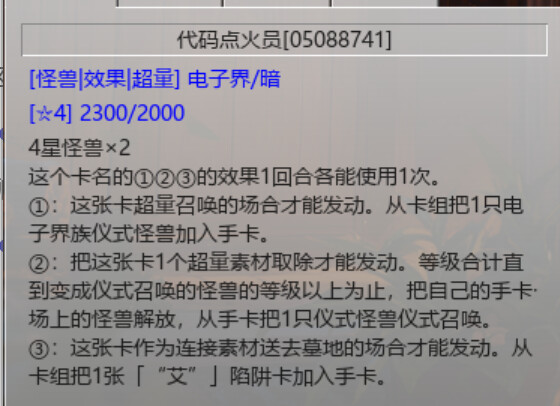 ②:这张卡从手卡·场上送去墓地的场合才能发动。从卡组将一只电子界族怪兽送去墓地。仪式召唤的这张卡被送去墓地的场合,也可以将送去墓地改为特殊召唤。这个回合,自己不是电子界族怪兽不能特殊召唤。