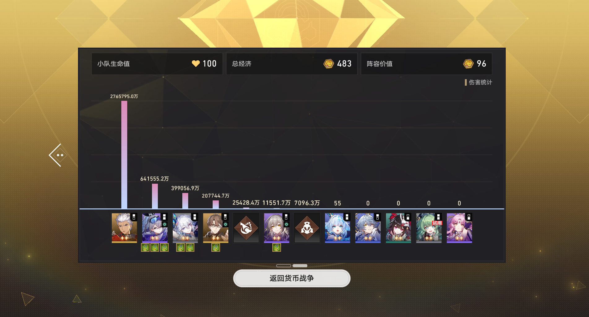 击破队:21流萤60忘归人21大丽花10灵砂打骑士。
