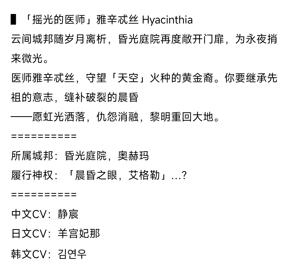 传说,雅科达很久以前曾居住在蒙德。有一天她对提瓦特的一切感到厌倦,决定毁灭这个世界,前往其他世界探索。然而当足以毁灭提瓦特的力量第一次触及到星落湖的鱼时,雅科达却突然被神秘的力量镇压。当雅科达回过神来后,发现这里俨然是西风骑士团的禁闭室。从禁闭室出来后,雅科达决定为曾犯下的罪行自我放逐,隐姓埋名,直到那位犯下渎死之罪者复苏。。。