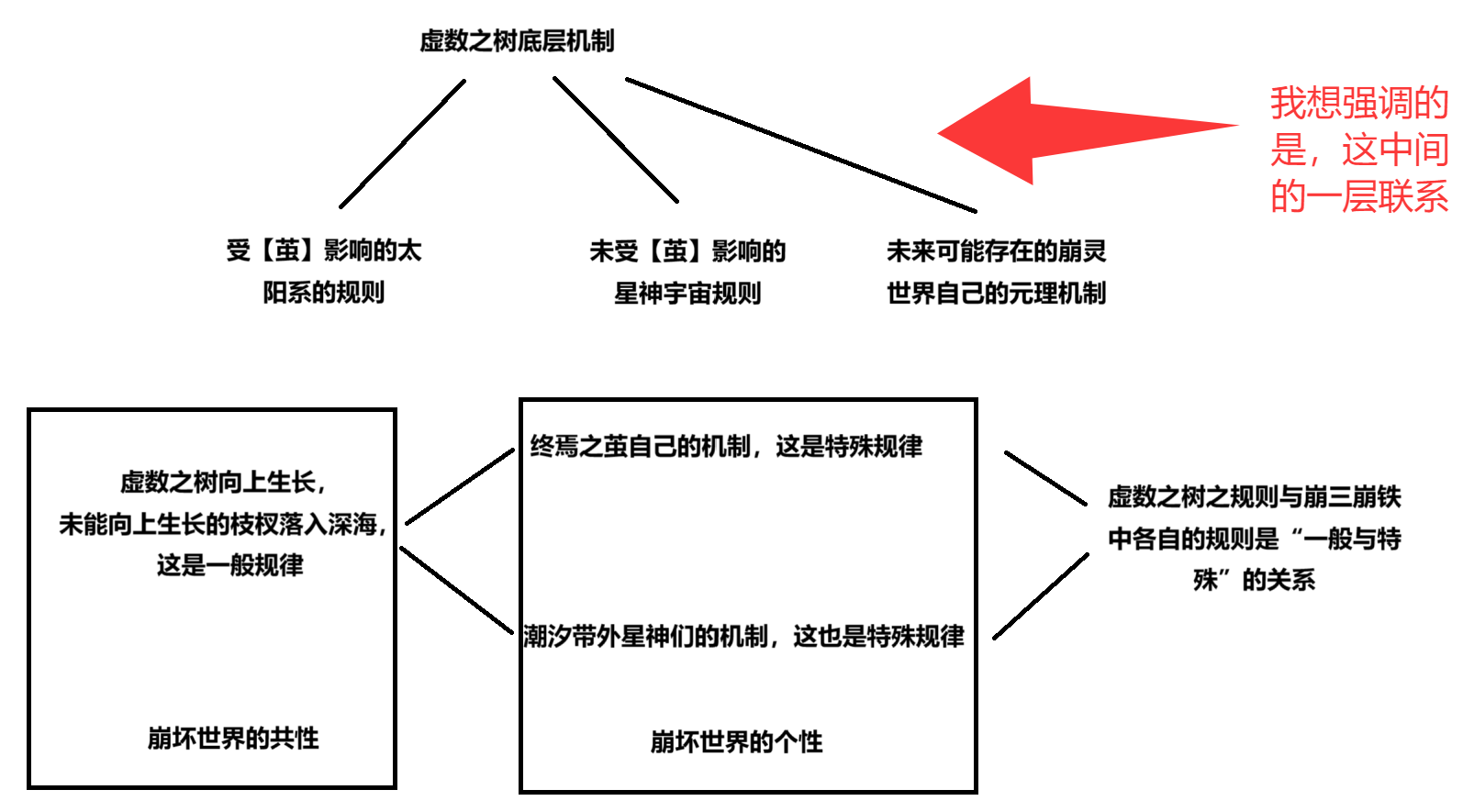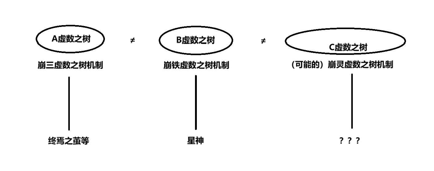 我们一开始聊的是“虚数之树”在崩三和崩铁中概念的同一性问题,你说这两个概念并非同一,而我指正说“这两个概念同一,因为它们都指向同一个虚数之树”(即我画的图)