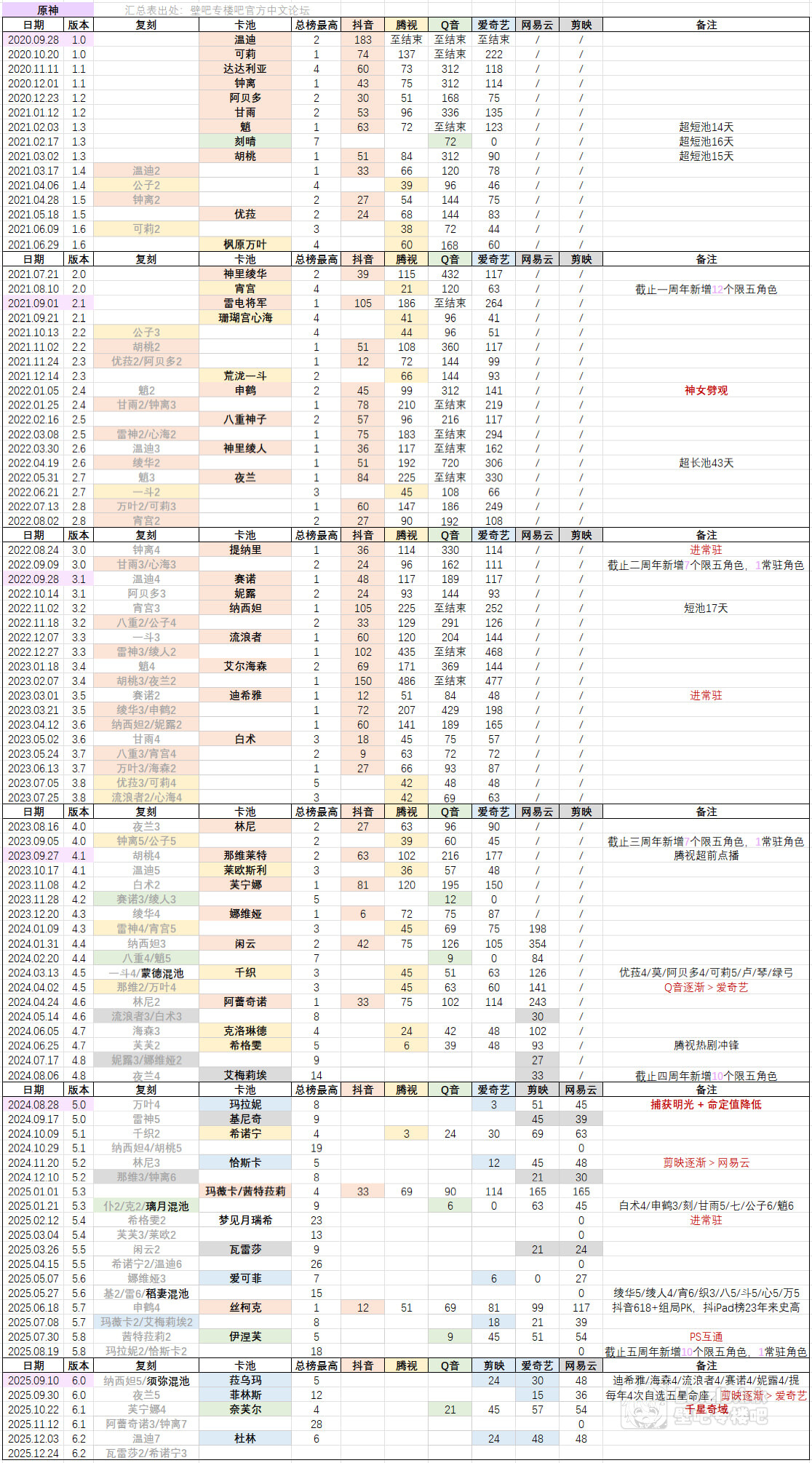 日期【浅紫色填充】代表“首充重置”,卡池【标红】代表赠送一个本体