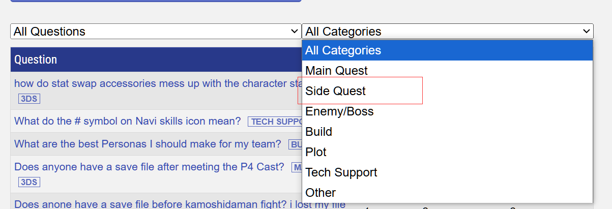 PQ,即女神异闻录Q系列,是在3DS上的女神异闻录外传系列,玩法上采用了世界树迷宫主打的画地图探索迷宫玩法,但是可选角色均为女神异闻录本家角色,PQ(女神异闻录Q:迷宫暗影)可选的角色为P3&P4主角团全员,PQ2(女神异闻录Q2:新剧场迷宫)可选角色在PQ的基础上追加了P5的怪盗团