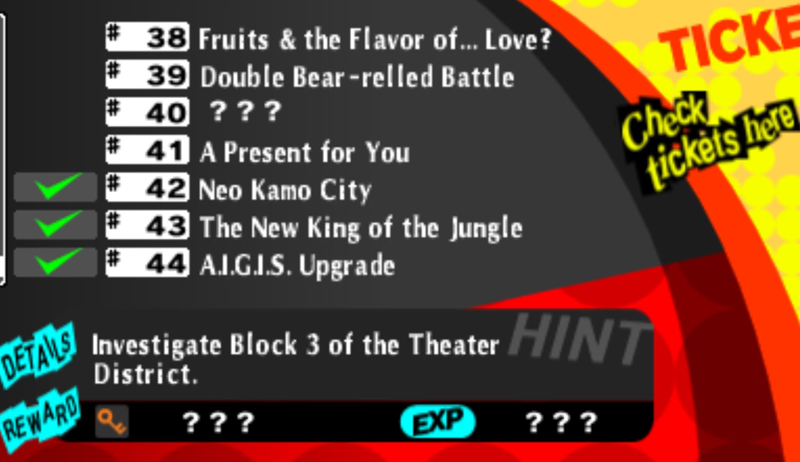 45(队内必需携带哈姆子):完成后解锁Michael(忘了这个P翻译是什么了艹)合成,跟伊丽莎白对话可进行对战,胜利后解锁四位不羁P的进阶,亚森→撒旦叶(愚者,新技能加一行队友的两回合暴击)、伊邪那岐→伊邪那岐大神(世界,新被动大概率减少同列友方受到的物理伤害,比起原来的大神还多了咒免)、俄耳甫斯→俄耳甫斯·改(愚者,但是这个人把审判卡塞被动里了,增加属性技能伤害)、俄耳甫斯→弥赛亚(审判,新被动加强连锁技能)