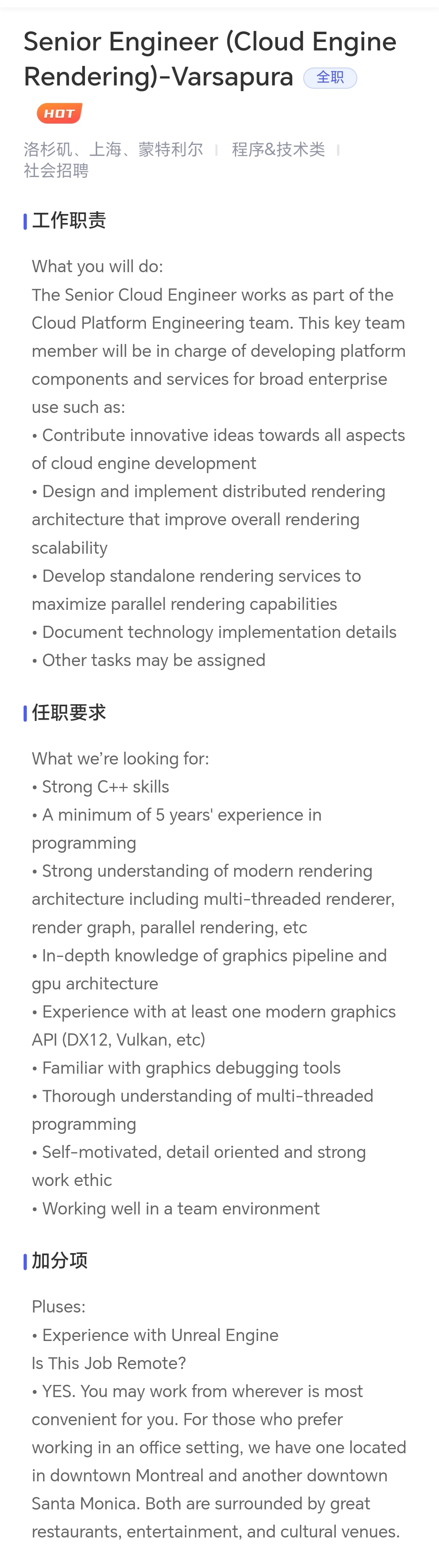 洛杉矶、上海、蒙特利尔 | 程序&技术类 | 社会招聘