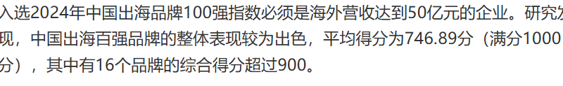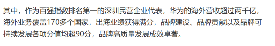 人民日报原话华为出海业绩获得满分,品牌建设、品牌贡献以及品牌可持续发展各项分值均超90,满分1000华为962分由此可得华为除海外业绩外至少有一项低于100分则除海外业绩外其他三项不会超过140分,考虑三项评分,我认为海外业绩应占640,其他三项各占120,另外此榜单数据来源包括企业主动申报,比之前跟财报都对不上的报告靠谱多了