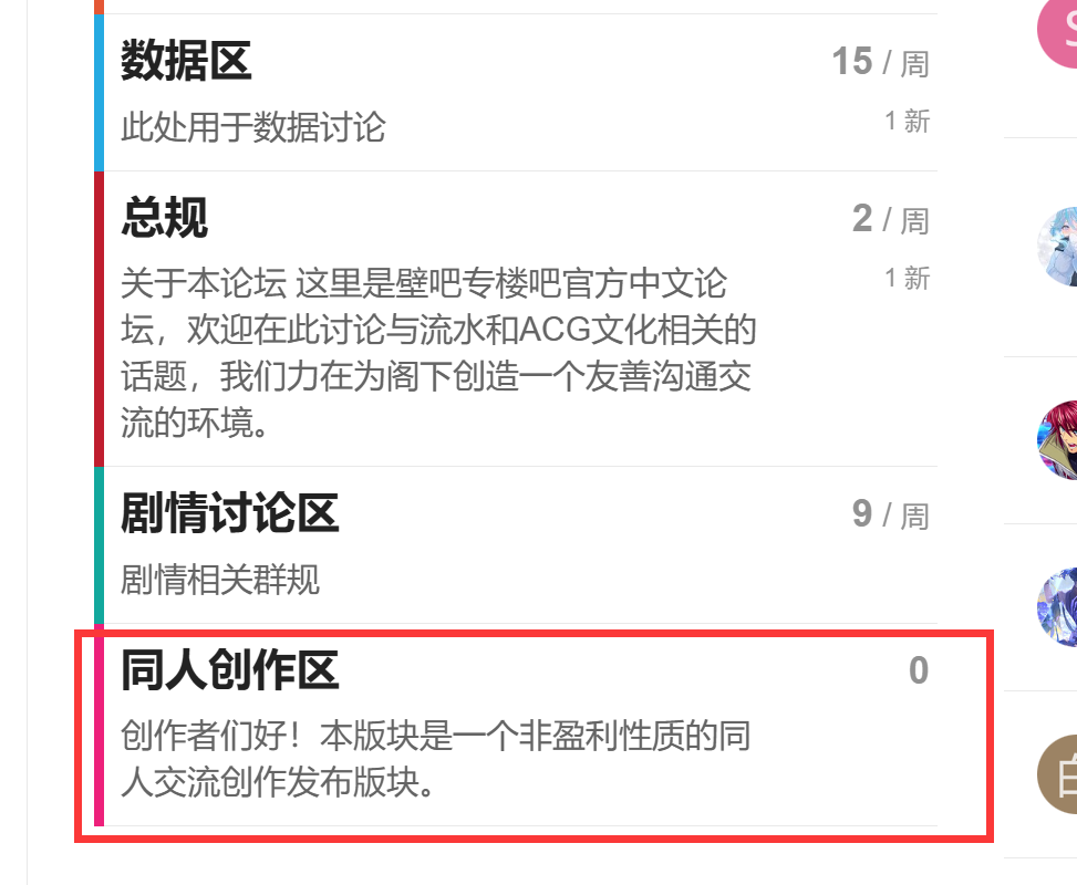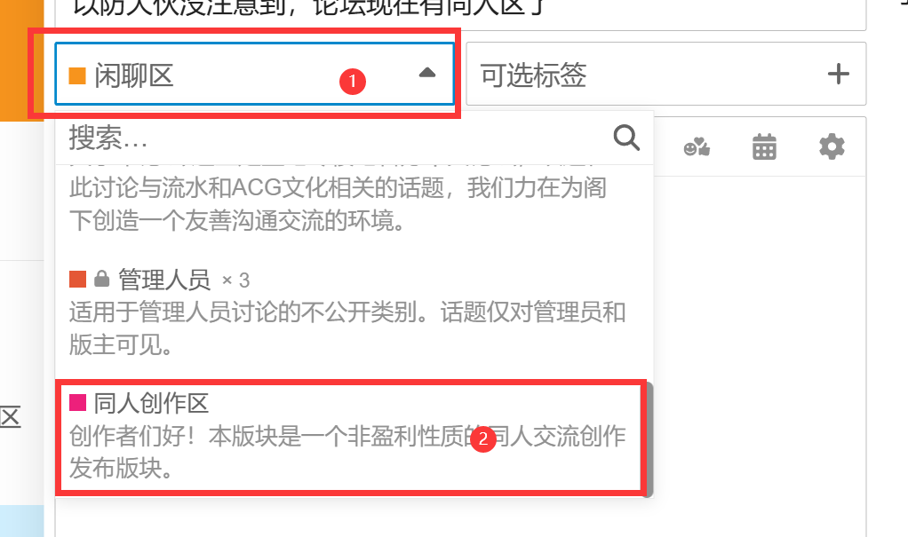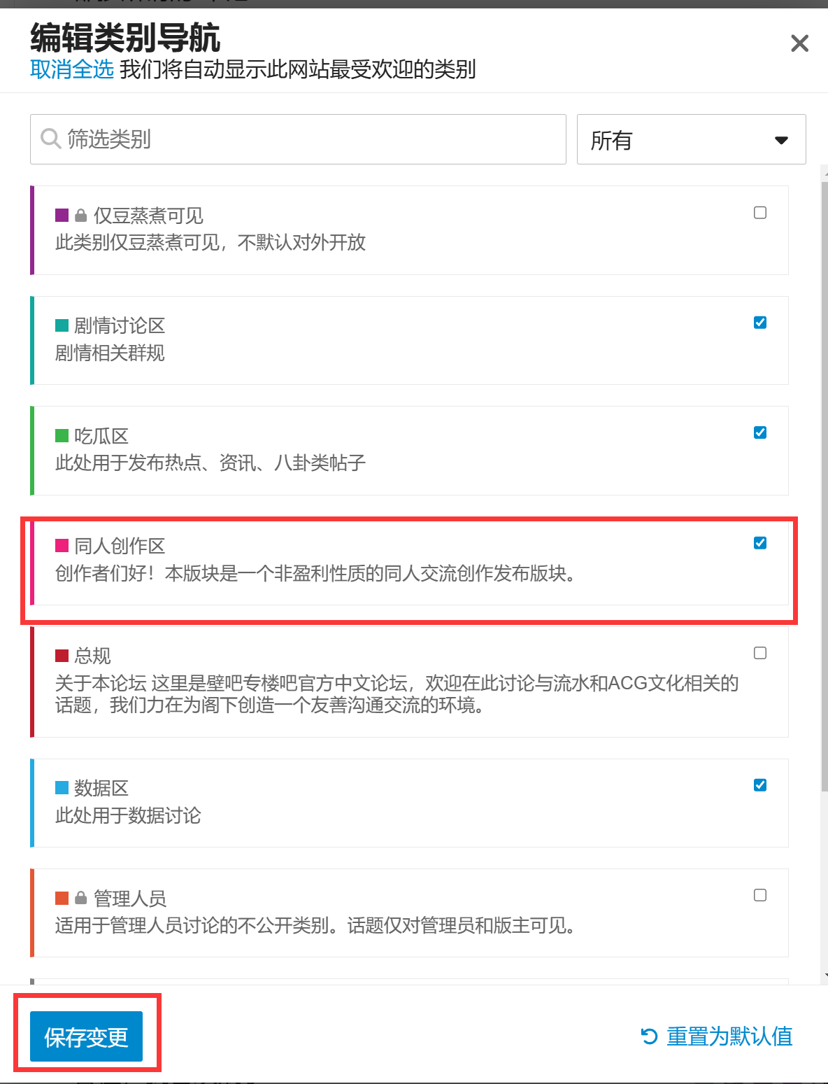 把同人创作区(或者其他你想翻着方便但是默认不显示的分区)勾上然后保存变更,同理也可以去取消掉一些你不想看的分区,记得保存变更