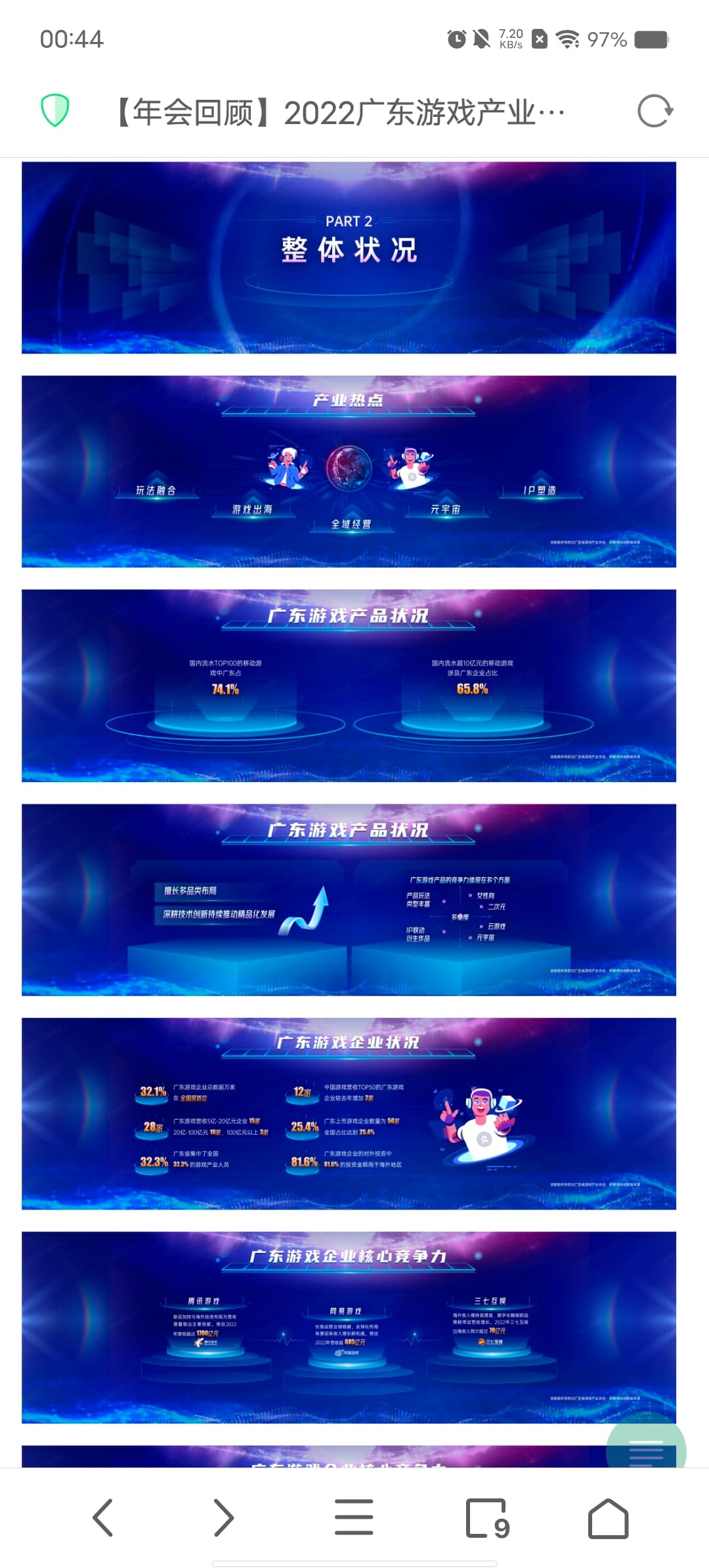 整体状况分别是:产业热点、广东游戏产品状况、广东游戏企业状况、广东游戏企业核心竞争力、广东游戏出海状况